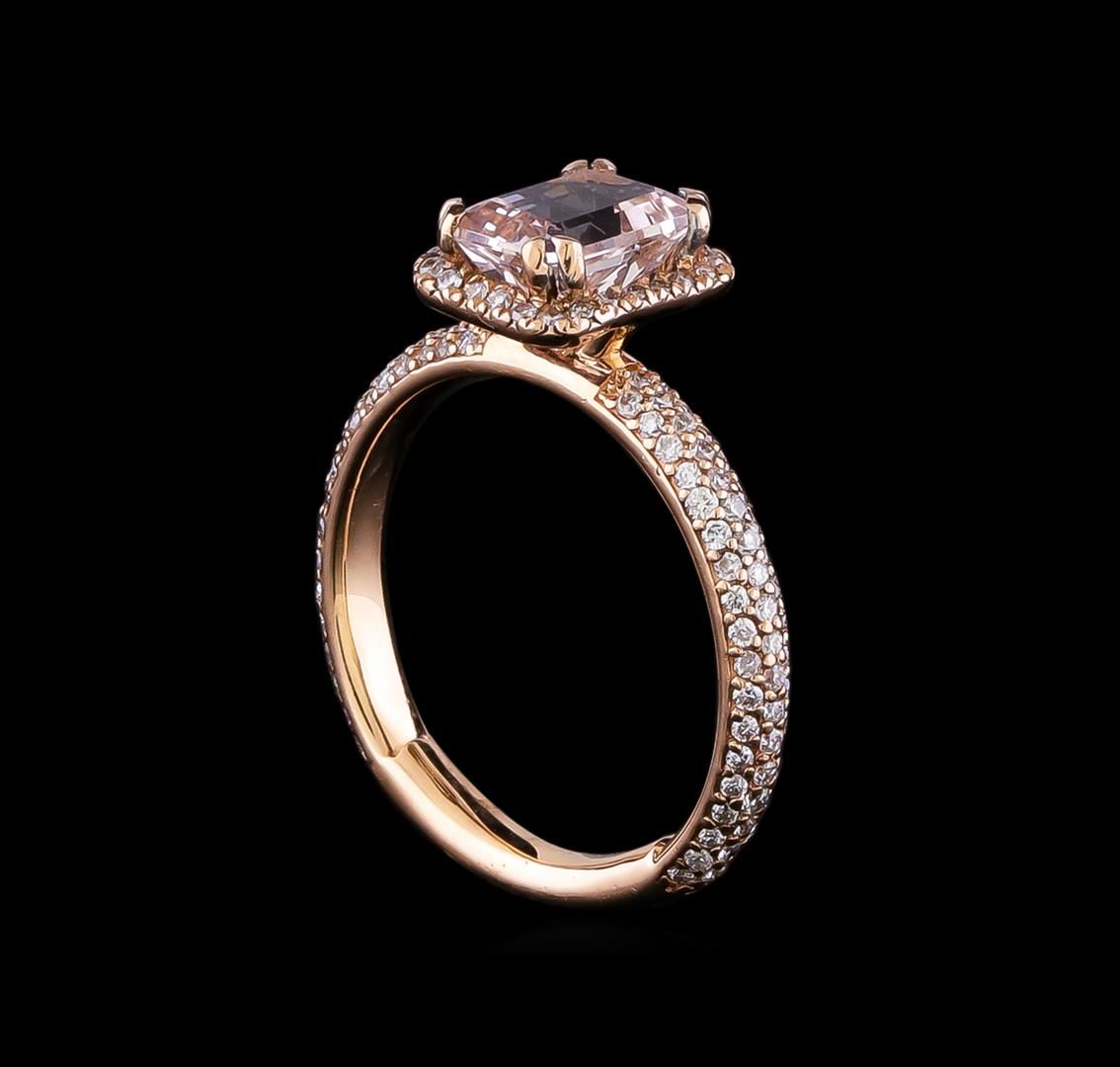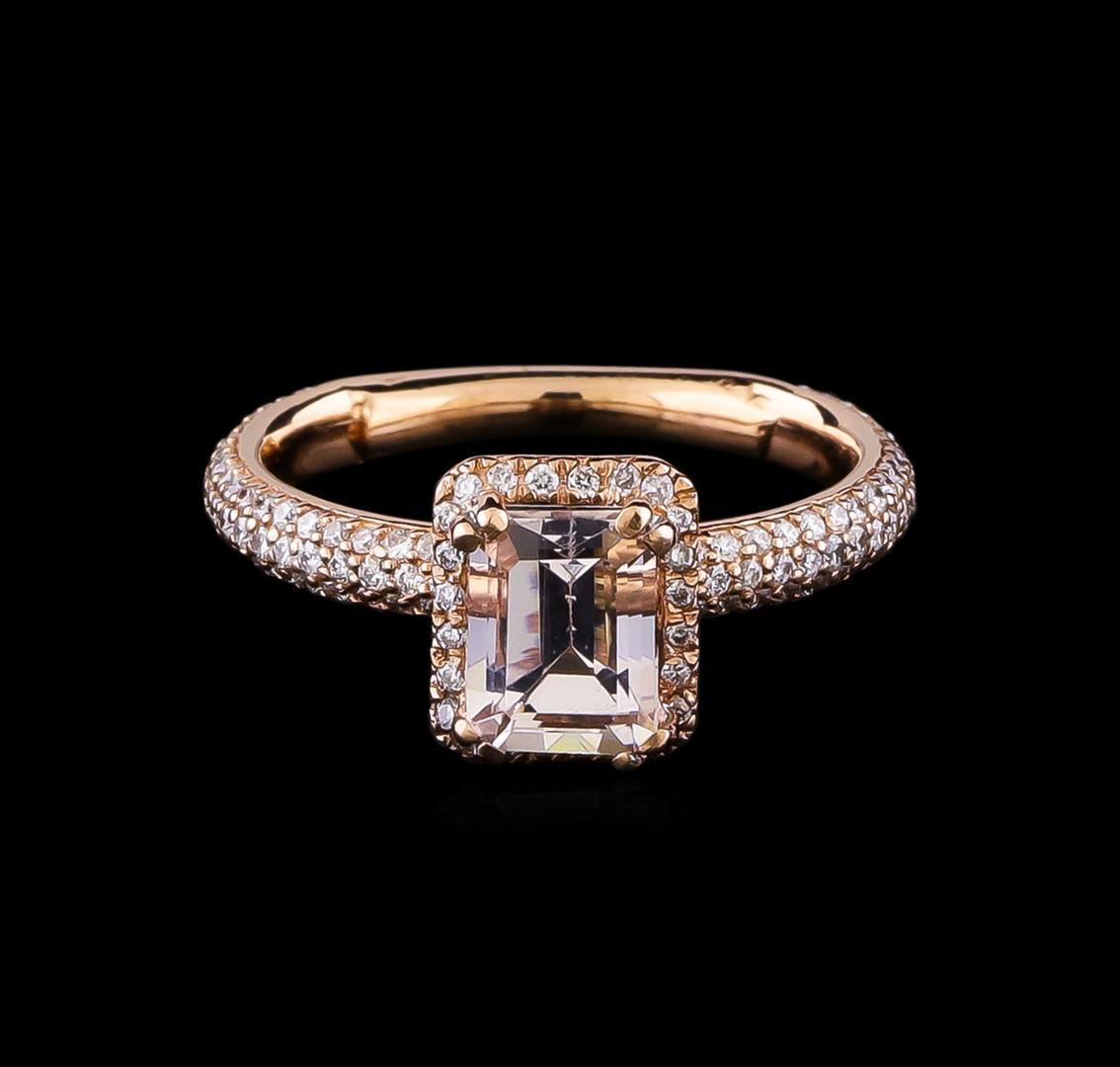 One electronically tested 14KT rose gold ladies cast morganite and diamond ring with a bright polish finish. The featured morganite is set within a diamond bezel supported by diamond set shoulders, completed by a two and one-half millimeter wide band. Condition is good. Containing: One prong set emerald step cut natural morganite, measuring 7.30 x 5.35 x 4.40mm, 6%. bulge factor, approximate weight of 1.35ct., clarity is slightly included, type I, very light, very slightly brownish, red color, (GIA R 2/3), cut is good. Transmitting light with a minimum of distortion, transparent. Naturally occurring internal & external characteristics are present. Graded in the setting. One Hundred Thirty-Two prong set round brilliant cut diamonds, measuring 1.00. - 0.90 x 0.57mm (depth est.) approximate total weight of 132 Stones = 0.50ct. Graded in the setting. Clarity: SI-1 to SI-2 . Color: G - I. Total Weight of Colored Stones 1.35ct.. Total Weight of Diamonds 0.50ct.. Total Weight of Ring 3.46gm. AIG Appraised at $3,335.00.