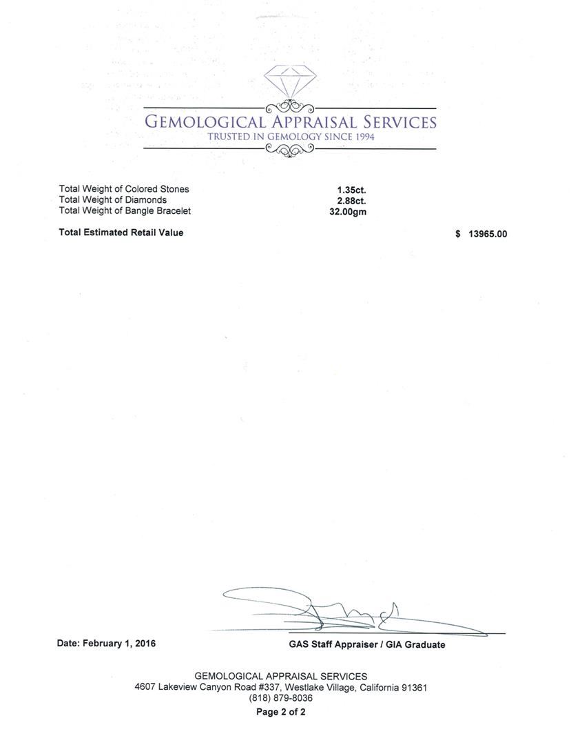 One electronically tested 14KT white gold lady's combination cast & assembled fashion bangle bracelet with a tongue clasp with foldover safety with a bright polish finish. The featured lady's bangle bracelet has a length of approximately 7 inches in length. Identified with markings of "K14". Condition is new, good workmanship. Containing: Thirteen prong set round modified brilliant cut natural blue sapphires, measuring 2.70 - 2.60 x 1.72 mm, approximate total weight of 1.35ct., clarity is eye clean, type II, medium dark, moderately strong, blue color, (GIA B 6/4), cut is very good. Colored gemstones are presumed to have been subjected to commonly used enhancement processes. Graded in the setting. Ten prong set round brilliant cut diamonds, measuring 2.25 - 2.15 x 1.36mm (depth est.) approximate total weight of 10 Stones = 0.40ct. Graded in the setting. Clarity: SI-1 to SI-2. Color: H - I. Cut Very Good Six prong set round brilliant cut diamonds, measuring 2.40 - 2.30 x 1.46mm (depth est.) approximate total weight of 6 Stones = 0.30ct. Graded in the setting. Clarity: SI-1 to SI-2. Color: H - I. Cut Very Good Two Hundred Seven prong set round brilliant cut diamonds, measuring 1.40 - 1.35 x 0.90mm (depth est.) approximate total weight of 207 Stones = 2.18ct. Graded in the setting. Clarity: SI-1 to I-1. Color: H - I. Cut Good. Total Weight of Colored Stones 1.35ct. Total Weight of Diamonds 2.88ct. Total Weight of Bangle Bracelet 32.00gm. GAS Appraised at $13,965.00.
