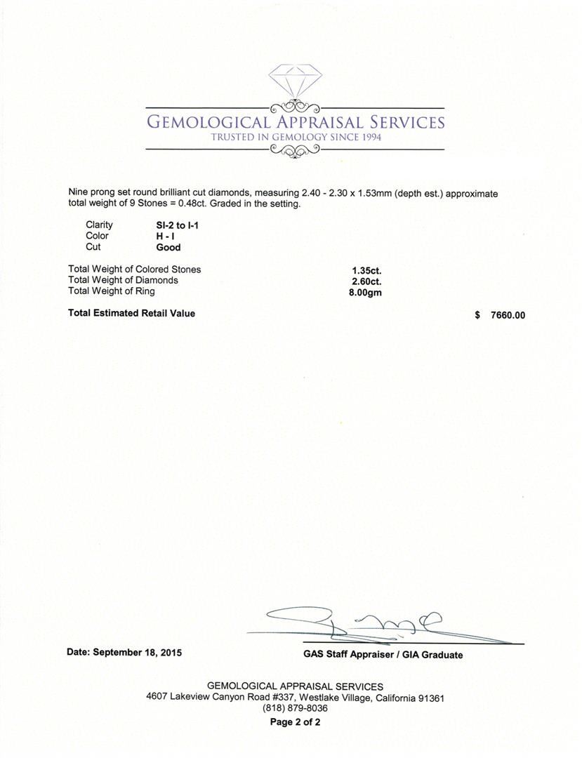 One electronically tested 14KT rose and white gold lady's combination cast & assembled fashion ring with a basket halo with a bright polish finish. The featured ladies ring has a shank that measures 2.95 millimeters in width. Identified with markings of "585". Condition is new, good workmanship. Containing: Eleven prong set round brilliant cut natural blue sapphires, measuring 2.90 - 2.80 x 1.86 mm, approximate total weight of 1.35ct., clarity is slightly included, type II, medium dark, moderately strong, blue color, (GIA B 6/4), cut is very good. Colored gemstones are presumed to have been subjected to commonly used enhancement processes. Indications of laboratory high temperature heat treatment. Graded in the setting. One prong set round brilliant cut diamond, measuring 3.90 - 3.80 x 2.39mm (depth est.) approximate weight of 0.21ct. Graded in the setting. Clarity: I-1. Color: Good Twenty-Four prong set round brilliant cut diamonds, measuring 2.50 - 2.40 x 1.59mm (depth est.) approximate total weight of 24 Stones = 1.43ct. Graded in the setting. Clarity: SI-2 to I-1. Color: I - Good Twenty-Seven prong set round brilliant cut diamonds, measuring 1.70 - 1.60 x 1.07mm (depth est.) approximate total weight of 27 Stones = 0.48ct. Graded in the setting. Clarity: SI-2 to I-1. Color: H - I. Cut Good Nine prong set round brilliant cut diamonds, measuring 2.40 - 2.30 x 1.53mm (depth est.) approximate total weight of 9 Stones = 0.48ct. Graded in the setting. Clarity: SI-2 to I-1. Color: H - I. Cut Good. Total Weight of Colored Stones 1.35ct. Total Weight of Diamonds 2.60ct. Total Weight of Ring 8.00gm. GAS Appraised at $7,660.00.