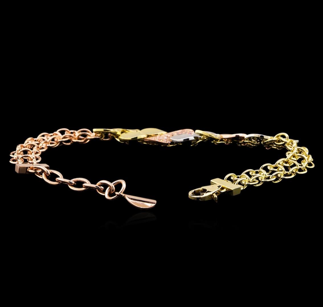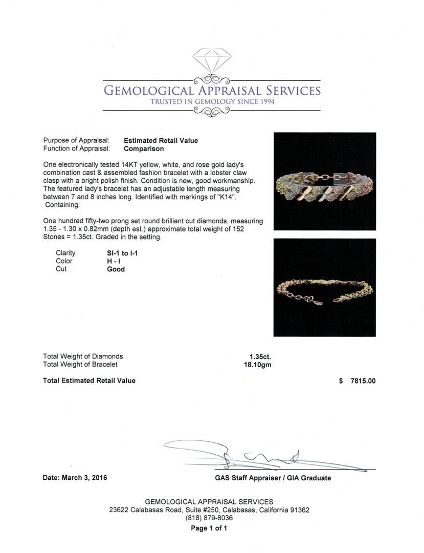 One electronically tested 14KT yellow, white, and rose gold lady's combination cast & assembled fashion bracelet with a lobster claw clasp with a bright polish finish. The featured lady's bracelet has an adjustable length measuring between 7 and 8 inches long. Identified with markings of "K14". Condition is new, good workmanship. Containing: One Hundred Fifty-Two prong set round brilliant cut diamonds, measuring 1.35 - 1.30 x 0.82mm (depth est.) approximate total weight of 152 Stones = 1.35ct. Graded in the setting. Clarity: SI-1 to I-1. Color: H - I. Cut Good. Total Weight of Diamonds 1.35ct. Total Weight of Bracelet 18.10gm. GAS Appraised at $7,815.00.