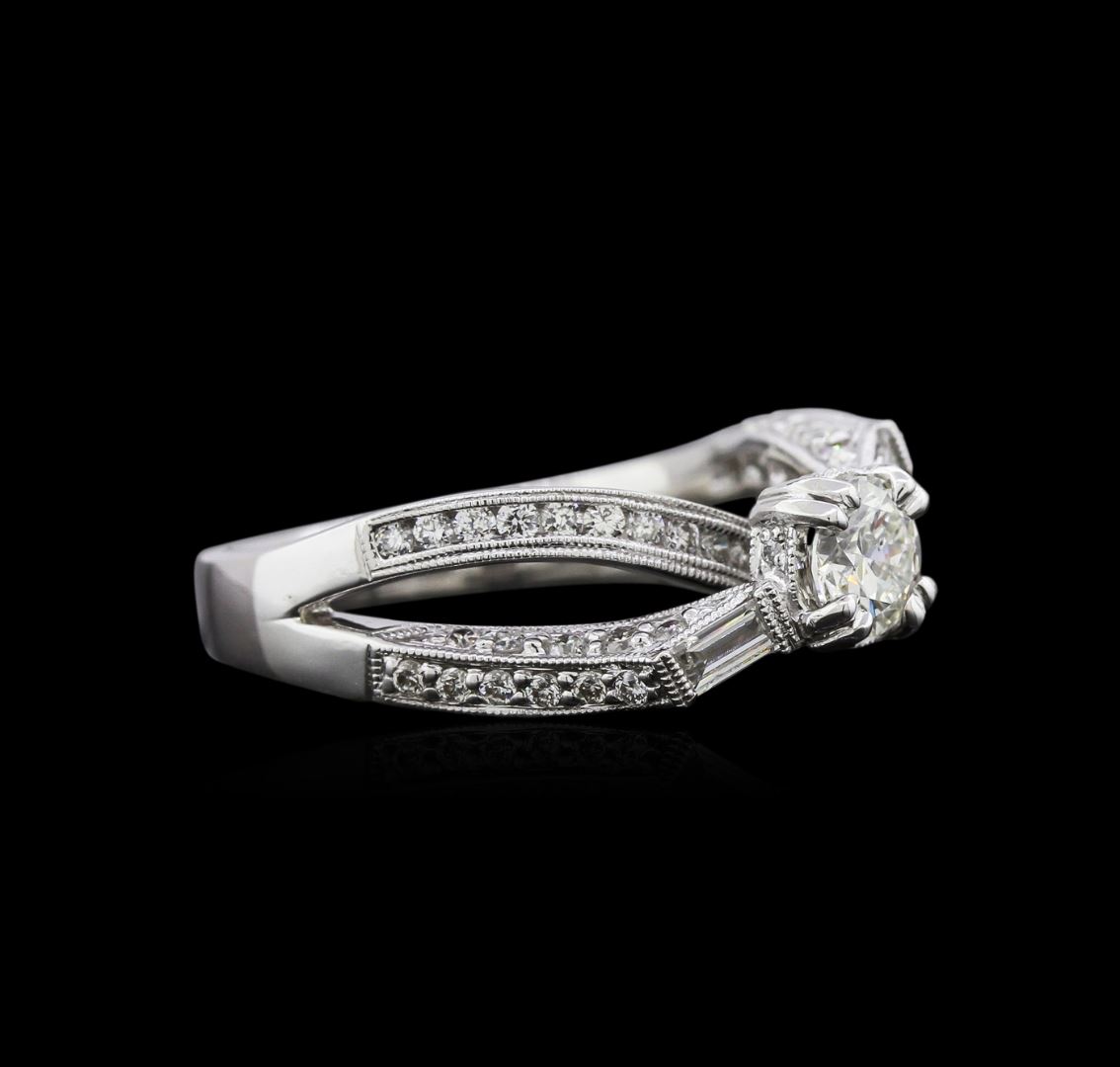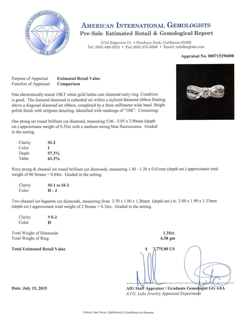 One electronically tested 18KT white gold ladies cast diamond unity ring. The featured diamond is cathedral set within a stylized diamond ribbon floating above a diagonal diamond set ribbon, completed by a three millimeter wide band. Bright polish finish with milgrain detailing. Identified with markings of "18K". Condition is good. Containing: One prong set round brilliant cut diamond, measuring 5.06 - 5.05 x 2.90mm (depth est.) approximate weight of 0.55ct with a medium strong blue fluorescence. Graded in the setting. Clarity: SI-2. Color: I. Depth 57.3%. Table 61.3%. Sixty prong & channel set round brilliant cut diamonds, measuring 1.40 - 1.30 x 0.81mm (depth est.) approximate total weight of 60 Stones = 0.64ct. Graded in the setting. Clarity: SI-1 to SI-2. Color: H - J Two channel set baguette cut diamonds, measuring from 3.70 x 1.80 x 1.26mm (depth est.) to 3.80 x 1.90 x 1.33mm (depth est.) approximate total weight of 2 Stones = 0.16ct. Graded in the setting. Clarity: VS-2. Color: H. Total Weight of Diamonds 1.35ct. Total Weight of Ring 6.58gm. AIG Appraised at $7,775.00.