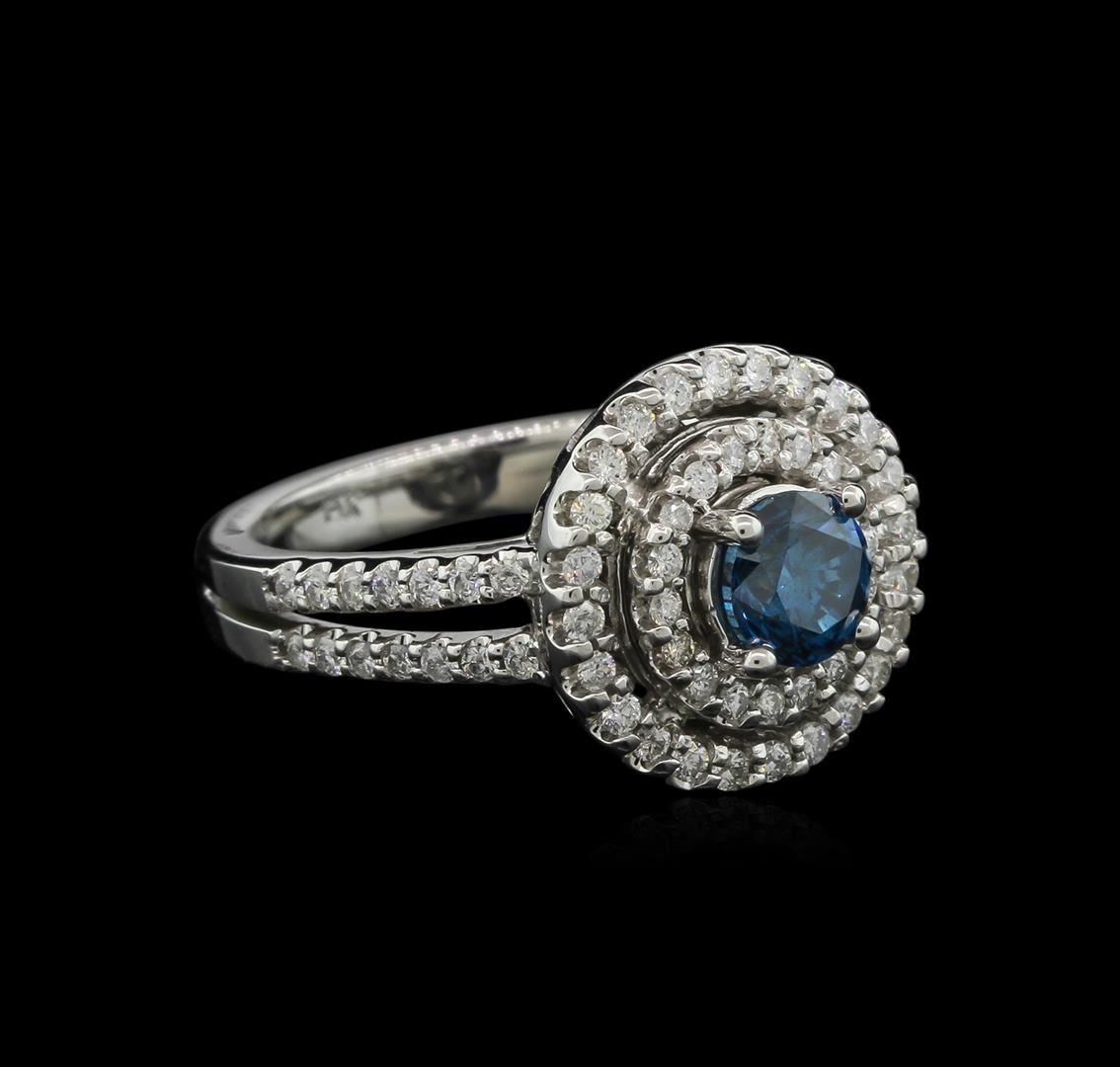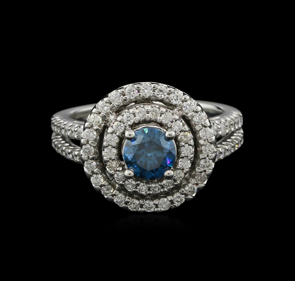One electronically tested 14KT white gold ladies cast diamond ring with a bright polish finish. The featured diamond is set within tiered diamond bezels supported by diamond set split shoulders, completed by a two and one-half millimeter wide band. Identified with markings of "14K". Condition is new, good workmanship. Containing: One prong set round brilliant cut diamond, measuring 5.55 - 5.50 x 3.30mm (depth est.), 6.00.%. GTCF approximate weight of 0.77ct. Indications of laboratory irradiated enhanced color. Graded in the setting. Clarity I-1 Depth 59.7%. Table 57.9%. Seventy prong set round brilliant cut diamonds approximate total weight of 70 Stones = 0.58ct. Graded in the setting. Clarity I-1 to I-2 Color G - I. Total Weight of Diamonds 1.35ct. Total Weight of Ring 7.12 grams. AIG Appraised at $5,365.00.