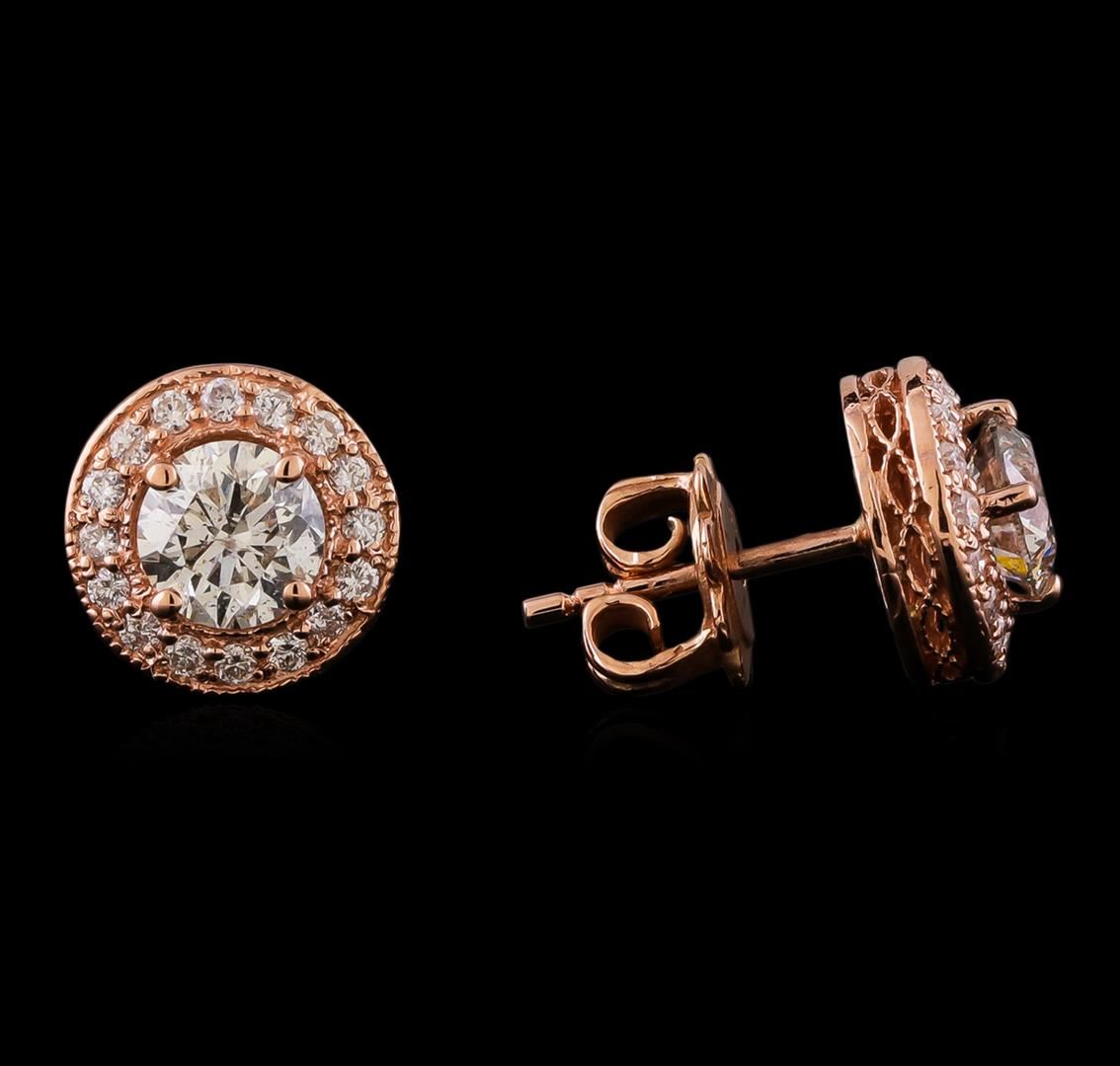 One pair electronically tested 14KT rose gold lady's combination cast & assembled halo earrings with medium friction backs with a bright polish with milgrain detailing finish. Identified with markings of "K14". Condition is new, good workmanship. Containing: Two prong set round brilliant cut diamonds, measuring 5.15 - 5.10 x 3.18mm (depth est.) , 5.00.%. GTCF approximate total weight of 2 Stones = 1.11ct. Graded in the setting. Clarity: SI-1 to SI-2. Color: I - J. Cut Very Good Thirty-Two prong set round brilliant cut diamonds, measuring 1.30 - 1.25 x 0.79mm (depth est.) approximate total weight of 32 Stones = 0.25ct. Graded in the setting. Clarity: SI-1 to SI-2. Color: H - I. Cut Good. Total Weight of Diamonds 1.36ct. Total Weight of Earrings 2.90gm. GAS Appraised at $7,160.00.