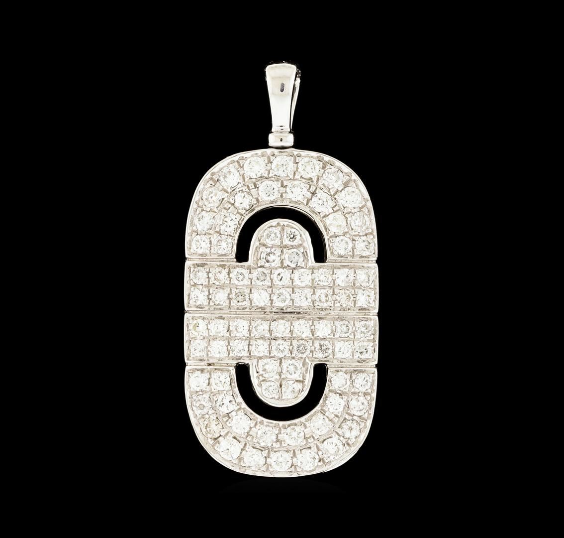 One electronically tested 18KT white gold lady's combination cast & assembled fashion pendant with a bright polish finish. Trademark is MICHA. Identified with markings of '18K 750'. Condition is new, good workmanship. Containing: Thirty-Eight prong set round brilliant cut diamonds, measuring 1.70 - 1.60 x 1.02mm (depth est.) approximate total weight of 38 Stones = 0.69ct. Graded in the setting. Clarity VS-2 to SI-2. Color: G - H Cut Very Good Forty-Four prong set round brilliant cut diamonds, measuring 1.60 - 1.55 x 0.98mm (depth est.) approximate total weight of 44 Stones = 0.67ct. Graded in the setting. Clarity VS-2 to SI-1. Color: G - H Cut Very Good. Total Weight of Diamonds 1.36ct.. Total Weight of Pendant 6.10gm. GAS Appraised at $4,755.00.