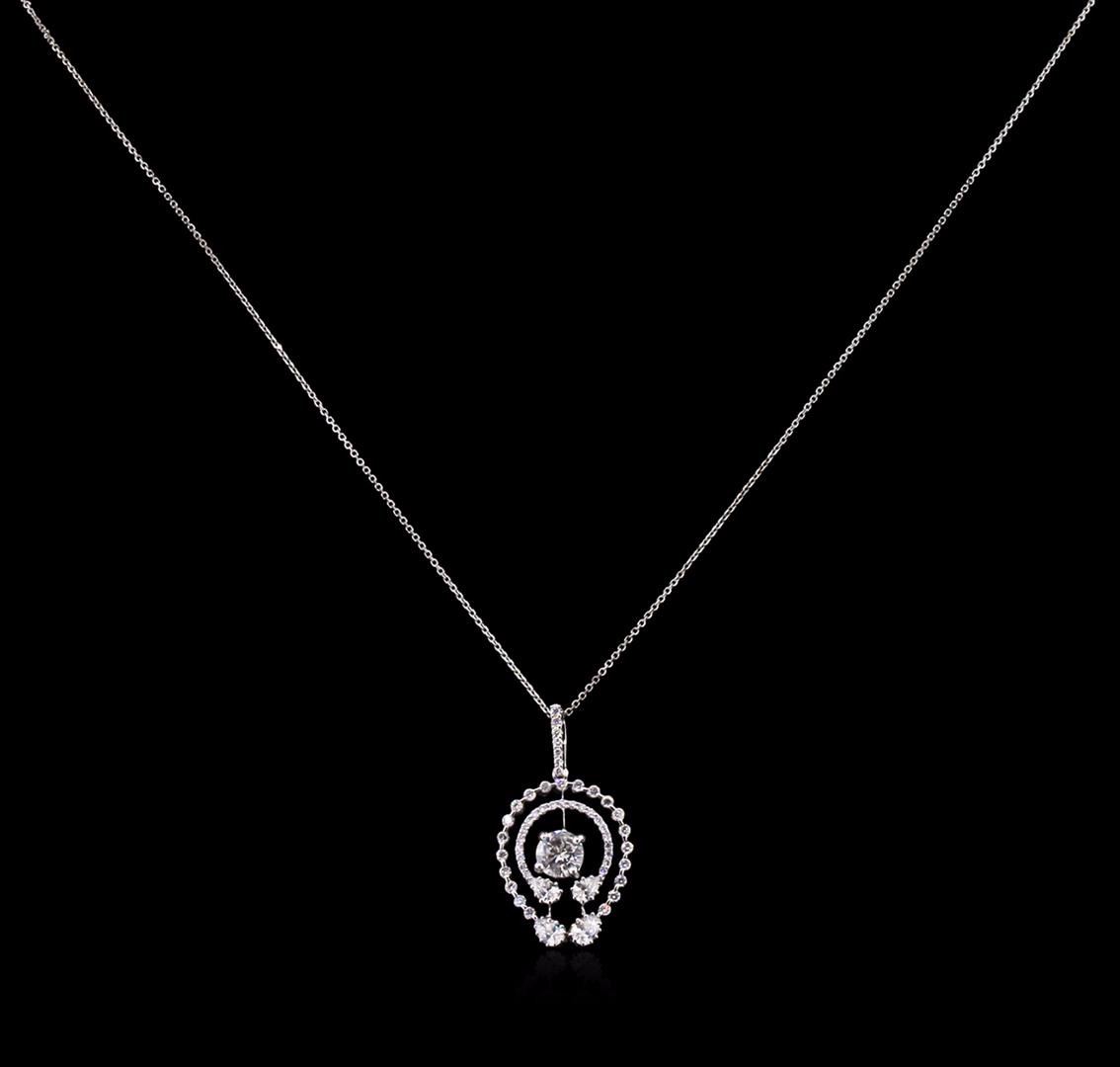 One electronically tested 14-18KT white gold lady's combination cast & assembled fashion pendant & chain 18.0" long, 1.00 mm diamond cut cable link with a spring ring clasp with a bright polish finish. The featured ladies 18KT pendant has an attached 14KT chain. Identified with markings of "K18 / 14K". Condition is new, good workmanship. Containing: One prong set round brilliant cut diamond, measuring 5.50 - 5.40 x 3.06mm (depth est.) , 5.00% GTCF approximate weight of 0.59ct. Graded in the setting. Clarity: I-1. Color: I. Cut Good Two prong set pear shaped cut diamonds, measuring 4.00 x 2.80 x 1.77mm (depth est.) approximate total weight of 2 Stones = 0.24ct. Graded in the setting. Clarity: SI-1. Color: H - I. Cut Good Two prong set pear shaped cut diamonds, measuring 3.80 x 2.60 x 1.64mm (depth est.) approximate total weight of 2 Stones = 0.20ct. Graded in the setting. Clarity: VS-2 to SI-1. Color: H - I. Cut Good Forty-Nine prong set round brilliant cut diamonds, measuring 1.30 - 1.00 x 0.75mm (depth est.) approximate total weight of 49 Stones = 0.33ct. Graded in the setting. Clarity: VS-1 to VS-2. Color: F - Very Good. Total Weight of Diamonds 1.36ct. Total Weight of Pendant & Chain 3.80gm GAS Appraised at $6,530.00.