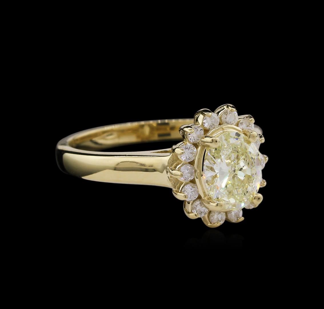 One electronically tested 14KT yellow gold lady's cast wedding ring with a basket halo with a bright polish finish. The featured lady's ring has a shank measuring 2.16 millimeters wide. Identified with markings of "14K". Condition is new, good workmanship. Containing: One prong set oval shaped cut diamond, measuring 7.28 x 5.87 x 3.70mm (depth est.) , 10.00.%. GTCF approximate weight of 1.11ct. Graded in the setting. Clarity: SI-2 Cut Very Good Fourteen prong set round brilliant cut diamonds, measuring 1.70 - 1.60 x 1.06mm (depth est.) approximate total weight of 14 Stones = 0.25ct. Graded in the setting. Clarity: SI-2 to I-1. Color: G - Good. Total Weight of Diamonds 1.36ct. Total Weight of Ring 4.00gm. GAS Appraised at $10,870.00.