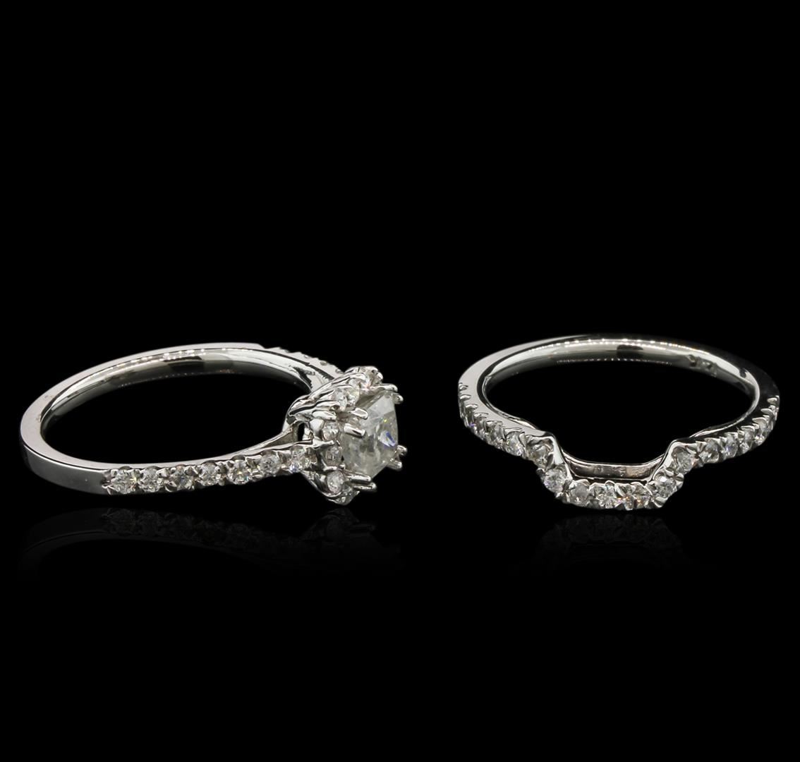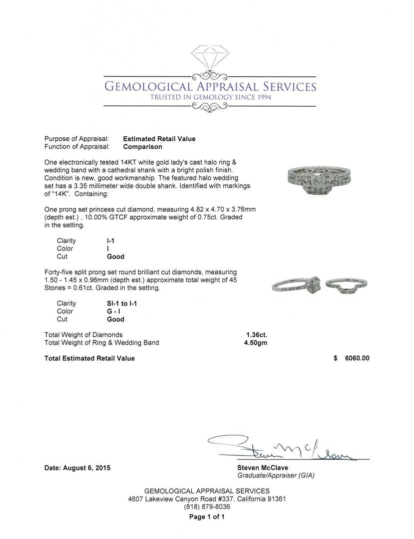 One electronically tested 14KT white gold lady's cast halo ring & wedding band with a cathedral shank with a bright polish finish. The featured halo wedding set has a 3.35 millimeter wide double shank. Identified with markings of "14K". Condition is new, good workmanship. Containing: One prong set princess cut diamond, measuring 4.82 x 4.70 x 3.76mm (depth est.) , 10.00.%. GTCF approximate weight of 0.75ct. Graded in the setting. Clarity: I-1. Color: I. Cut Good Forty-Five split prong set round brilliant cut diamonds, measuring 1.50 - 1.45 x 0.96mm (depth est.) approximate. Total Weight of 45 Stones = 0.61ct. Graded in the setting. Clarity: SI-1 to I-1. Color: G - I. Cut Good. Total Weight of Diamonds 1.36ct. Total Weight of Ring & Wedding Band 4.50gm. GAS Appraised at $6,060.00.