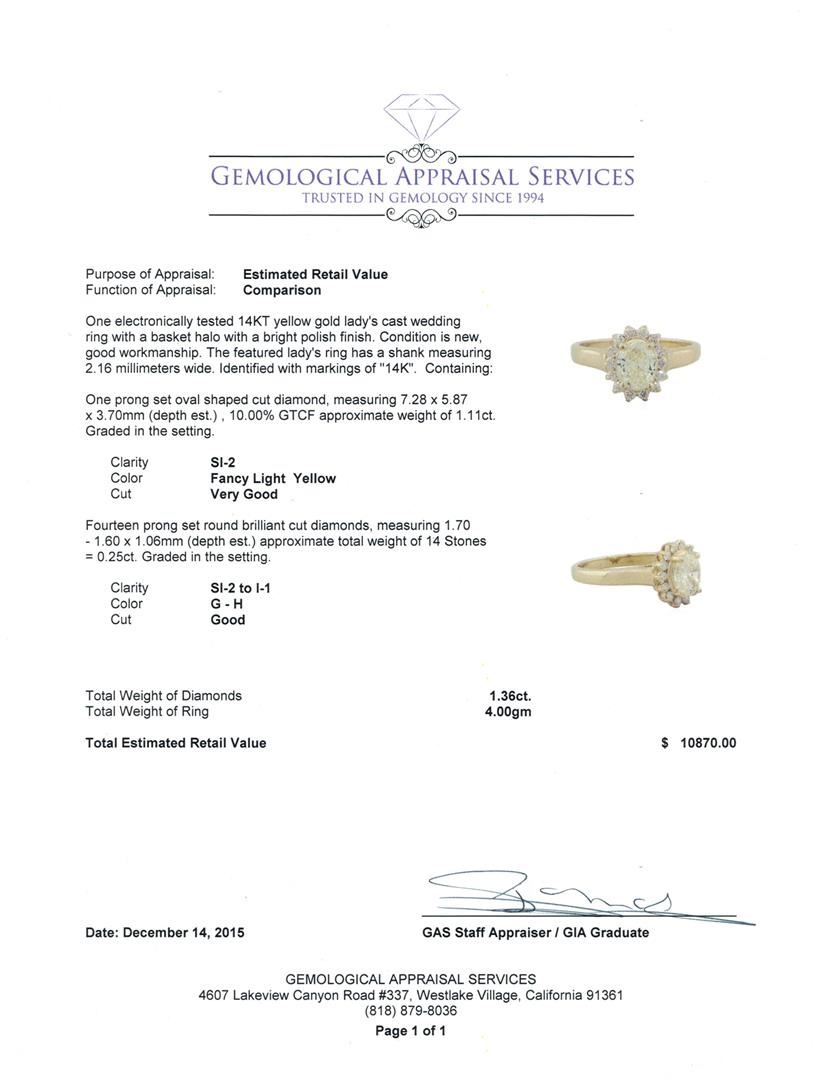 One electronically tested 14KT yellow gold lady's cast wedding ring with a basket halo with a bright polish finish. The featured lady's ring has a shank measuring 2.16 millimeters wide. Identified with markings of "14K". Condition is new, good workmanship. Containing: One prong set oval shaped cut diamond, measuring 7.28 x 5.87 x 3.70mm (depth est.) , 10.00.%. GTCF approximate weight of 1.11ct. Graded in the setting. Clarity: SI-2 Cut Very Good Fourteen prong set round brilliant cut diamonds, measuring 1.70 - 1.60 x 1.06mm (depth est.) approximate total weight of 14 Stones = 0.25ct. Graded in the setting. Clarity: SI-2 to I-1. Color: G - Good. Total Weight of Diamonds 1.36ct. Total Weight of Ring 4.00gm. GAS Appraised at $10,870.00.