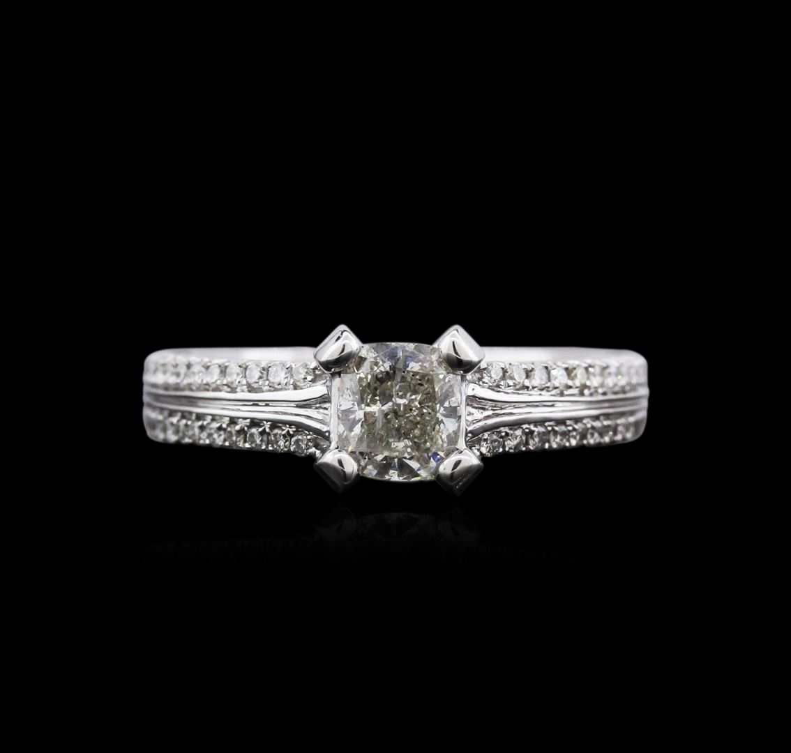 One electronically tested 18KT white gold ladies cast diamond unity ring with a bright polish finish. The featured diamond is supported by diamond set shoulders, completed by a two and one-half millimeter wide band. Identified with markings of "18K 750". Condition is good. Containing: One prong set cushion cut diamond, measuring 5.45 x 4.85 x 3.30mm (depth est.), 8.00.%. GTCF approximate weight of 0.90ct with a faint blue fluorescence. Faint brown secondary color throughout. Graded in the setting. Clarity: I-1. Color: K. Depth 68.0%. Table 61.9%. Sixty-Six prong set round brilliant cut diamonds, measuring 1.20 - 1.10 x 0.69mm (depth est.) approximate total weight of 66 Stones = 0.46ct. Graded in the setting. Clarity: SI-1 to SI-2. Color: H - J. Total Weight of Diamonds 1.36ct. Total Weight of Ring 5.56gm. AIG Appraised at $7,375.00.