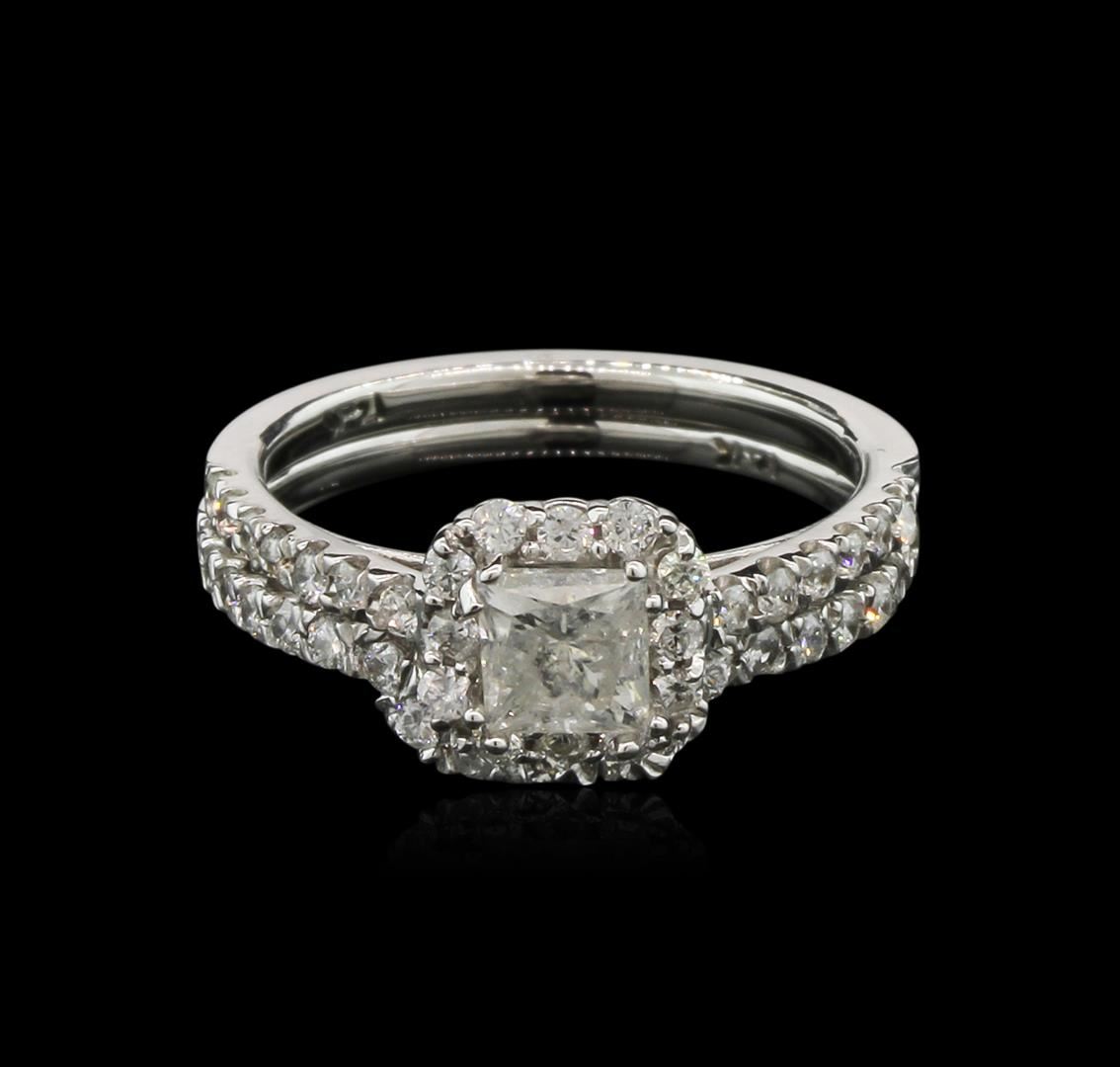 One electronically tested 14KT white gold lady's cast halo ring & wedding band with a cathedral shank with a bright polish finish. The featured halo wedding set has a 3.35 millimeter wide double shank. Identified with markings of "14K". Condition is new, good workmanship. Containing: One prong set princess cut diamond, measuring 4.82 x 4.70 x 3.76mm (depth est.) , 10.00.%. GTCF approximate weight of 0.75ct. Graded in the setting. Clarity: I-1. Color: I. Cut Good Forty-Five split prong set round brilliant cut diamonds, measuring 1.50 - 1.45 x 0.96mm (depth est.) approximate. Total Weight of 45 Stones = 0.61ct. Graded in the setting. Clarity: SI-1 to I-1. Color: G - I. Cut Good. Total Weight of Diamonds 1.36ct. Total Weight of Ring & Wedding Band 4.50gm. GAS Appraised at $6,060.00.