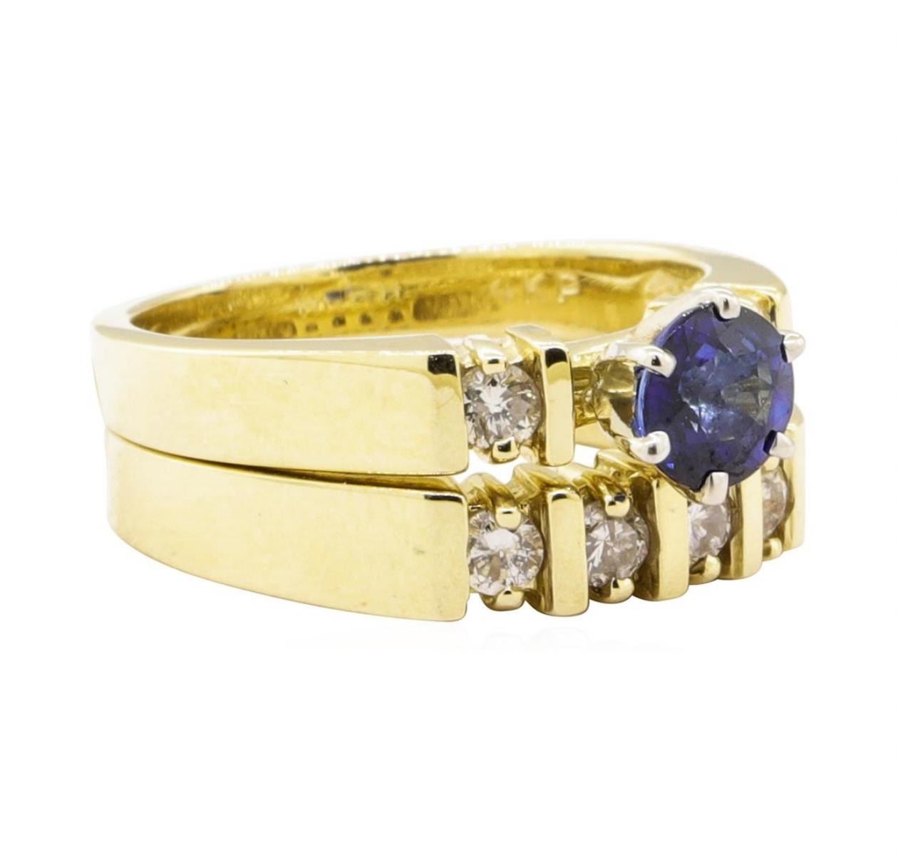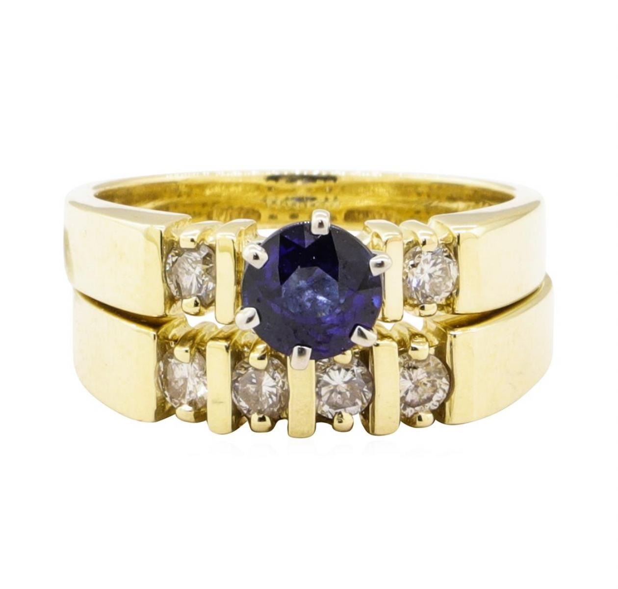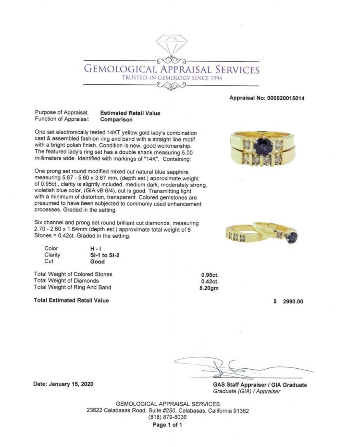 One set electronically tested 14KT yellow gold lady's combination cast & assembled fashion ring and band with a straight line motif with a bright polish finish. The featured lady's ring set has a double shank measuring 5.00 millimeters wide. Identified with markings of '14K'. Condition is new, good workmanship. Containing: One prong set round modified mixed cut natural blue sapphire, measuring 5.67 - 5.60 x 3.67 mm, (depth est.) approximate weight of 0.95ct., clarity is slightly included, medium dark, moderately strong, violetish blue color, (GIA vB 6/4), cut is good. Transmitting light with a minimum of distortion, transparent. Colored gemstones are presumed to have been subjected to commonly used enhancement processes. Graded in the setting. Six channel and prong set round brilliant cut diamonds, measuring 2.70 - 2.60 x 1.64mm (depth est.) approximate total weight of 6 Stones = 0.42ct. Graded in the setting. Color H - I Clarity SI-1 to SI-2 Cut Good. Total Weight of Colored Stones 0.95ct.. Total Weight of Diamonds 0.42ct.. Total Weight of Ring And Band 8.20gm GAS Appraised at $2990.00. GAS Appraised.