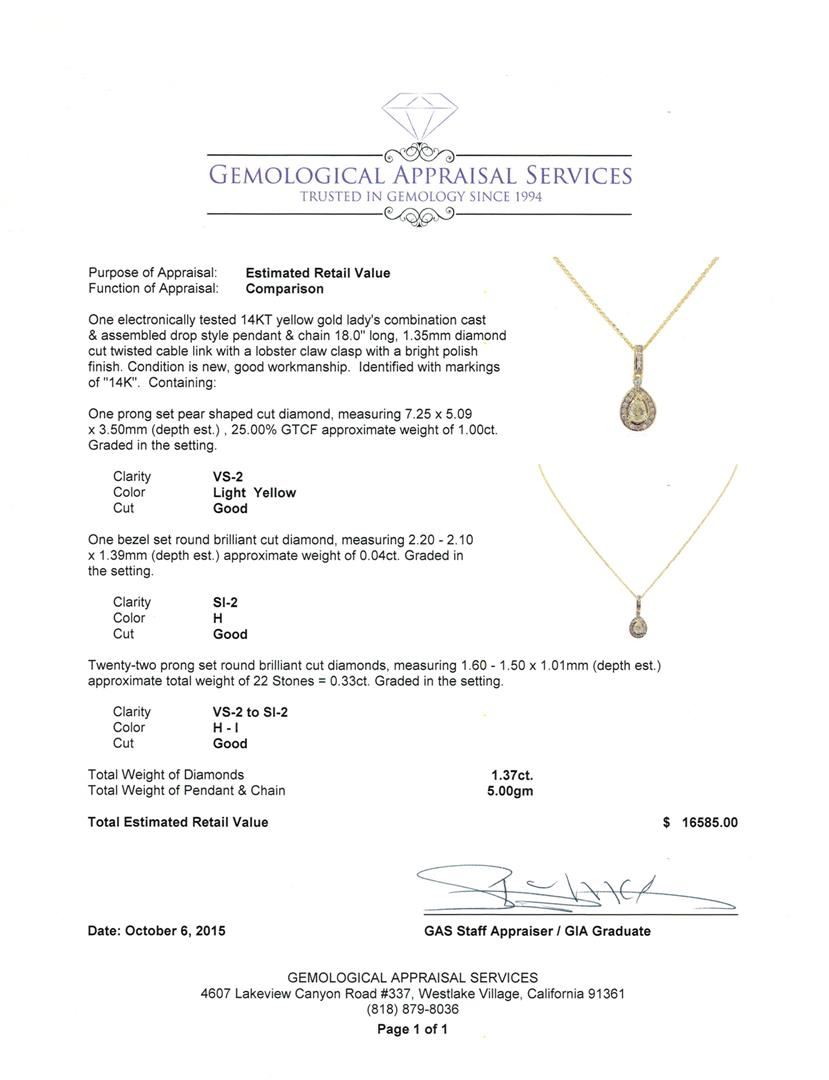 One electronically tested 14KT yellow gold lady's combination cast & assembled drop style pendant & chain 18.0" long, 1.35mm diamond cut twisted cable link with a lobster claw clasp with a bright polish finish. Identified with markings of "14K". Condition is new, good workmanship. Containing: One prong set pear shaped cut diamond, measuring 7.25 x 5.09 x 3.50mm (depth est.) , 25.00.%. GTCF approximate weight of 1.00ct. Graded in the setting. Clarity: VS-2 Cut Good One bezel set round brilliant cut diamond, measuring 2.20 - 2.10 x 1.39mm (depth est.) approximate weight of 0.04ct. Graded in the setting. Clarity: SI-2. Color: Good Twenty-Two prong set round brilliant cut diamonds, measuring 1.60 - 1.50 x 1.01mm (depth est.) approximate total weight of 22 Stones = 0.33ct. Graded in the setting. Clarity: VS-2 to SI-2. Color: H - I. Cut Good. Total Weight of Diamonds 1.37ct. Total Weight of Pendant & Chain 5.00gm. GAS Appraised at $16,585.00.