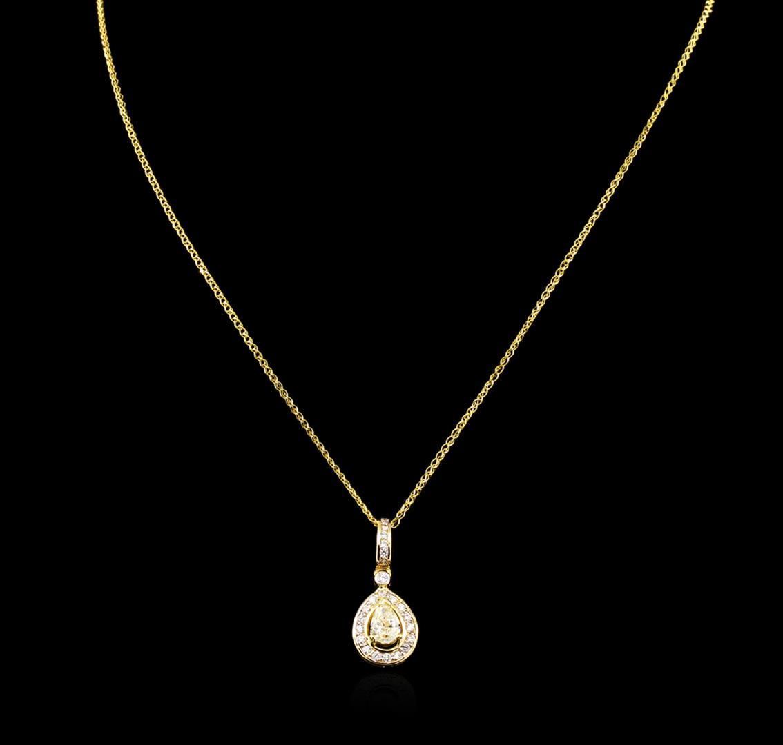 One electronically tested 14KT yellow gold lady's combination cast & assembled drop style pendant & chain 18.0" long, 1.35mm diamond cut twisted cable link with a lobster claw clasp with a bright polish finish. Identified with markings of "14K". Condition is new, good workmanship. Containing: One prong set pear shaped cut diamond, measuring 7.25 x 5.09 x 3.50mm (depth est.) , 25.00.%. GTCF approximate weight of 1.00 ct. Graded in the setting. Clarity: VS-2 Cut Good One bezel set round brilliant cut diamond, measuring 2.20 - 2.10 x 1.39mm (depth est.) approximate weight of 0.04ct. Graded in the setting. Clarity: SI-2. Color: Good Twenty-Two prong set round brilliant cut diamonds, measuring 1.60 - 1.50 x 1.01mm (depth est.) approximate total weight of 22 Stones = 0.33ct. Graded in the setting. Clarity: VS-2 to SI-2. Color: H - I. Cut Good. Total Weight of Diamonds 1.37ct. Total Weight of Pendant & Chain 5.00gm. GAS Appraised.