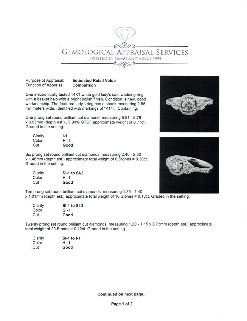 One electronically tested 14KT white gold lady's cast wedding ring with a basket halo with a bright polish finish. The featured lady's ring has a shank measuring 2.85 millimeters wide. Identified with markings of 'K14'. Condition is new, good workmanship. Containing: One prong set round brilliant cut diamond, measuring 5.81 - 5.76 x 3.65mm (depth est.) , 5.00.%. GTCF approximate weight of 0.77ct. Graded in the setting. Color H - I Clarity I-1 Cut Good Six prong set round brilliant cut diamonds, measuring 2.40 - 2.30 x 1.46mm (depth est.) approximate total weight of 6 Stones = 0.30ct. Graded in the setting. Color H - I Clarity SI-1 to SI-2 Cut Good Ten prong set round brilliant cut diamonds, measuring 1.85 - 1.40 x 1.01mm (depth est.) approximate total weight of 10 Stones = 0.18ct. Graded in the setting. Color G - I Clarity SI-1 to SI-2 Cut Good Twenty prong set round brilliant cut diamonds, measuring 1.20 - 1.15 x 0.73mm (depth est.) approximate total weight of 20 Stones = 0.12ct. Graded in the setting. Color H - I Clarity SI-1 to I-1 Cut Good. Total Weight of Diamonds 1.37ct.. Total Weight of Ring 4.30gm GAS Appraised at $7,410.00.
