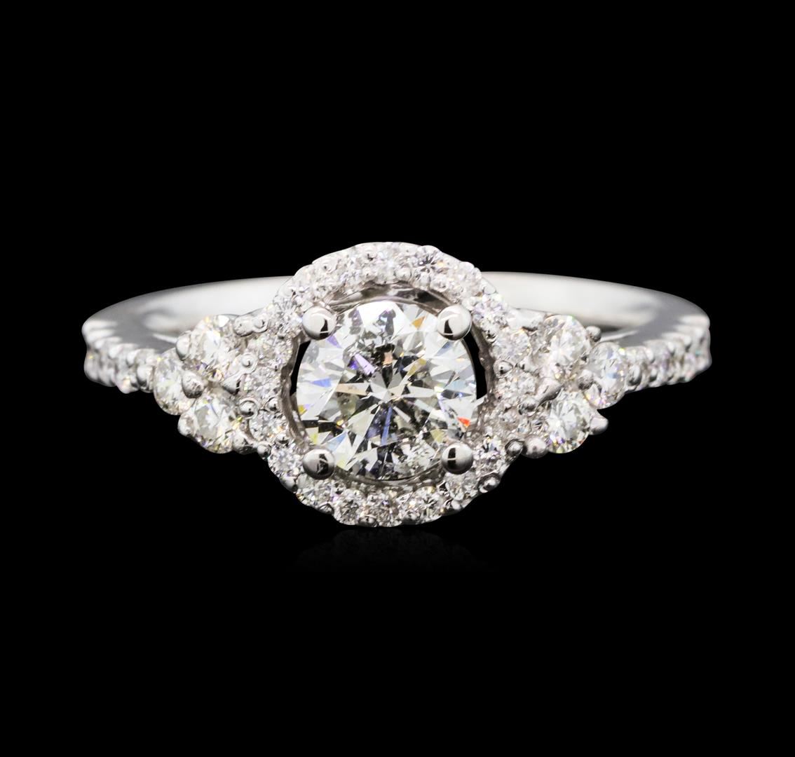 One electronically tested 14KT white gold lady's cast wedding ring with a basket halo with a bright polish finish. The featured lady's ring has a shank measuring 2.85 millimeters wide. Identified with markings of 'K14'. Condition is new, good workmanship. Containing: One prong set round brilliant cut diamond, measuring 5.81 - 5.76 x 3.65mm (depth est.) , 5.00.%. GTCF approximate weight of 0.77ct. Graded in the setting. Color H - I Clarity I-1 Cut Good Six prong set round brilliant cut diamonds, measuring 2.40 - 2.30 x 1.46mm (depth est.) approximate total weight of 6 Stones = 0.30ct. Graded in the setting. Color H - I Clarity SI-1 to SI-2 Cut Good Ten prong set round brilliant cut diamonds, measuring 1.85 - 1.40 x 1.01mm (depth est.) approximate total weight of 10 Stones = 0.18ct. Graded in the setting. Color G - I Clarity SI-1 to SI-2 Cut Good Twenty prong set round brilliant cut diamonds, measuring 1.20 - 1.15 x 0.73mm (depth est.) approximate total weight of 20 Stones = 0.12ct. Graded in the setting. Color H - I Clarity SI-1 to I-1 Cut Good. Total Weight of Diamonds 1.37ct.. Total Weight of Ring 4.30gm GAS Appraised at $7,410.00.