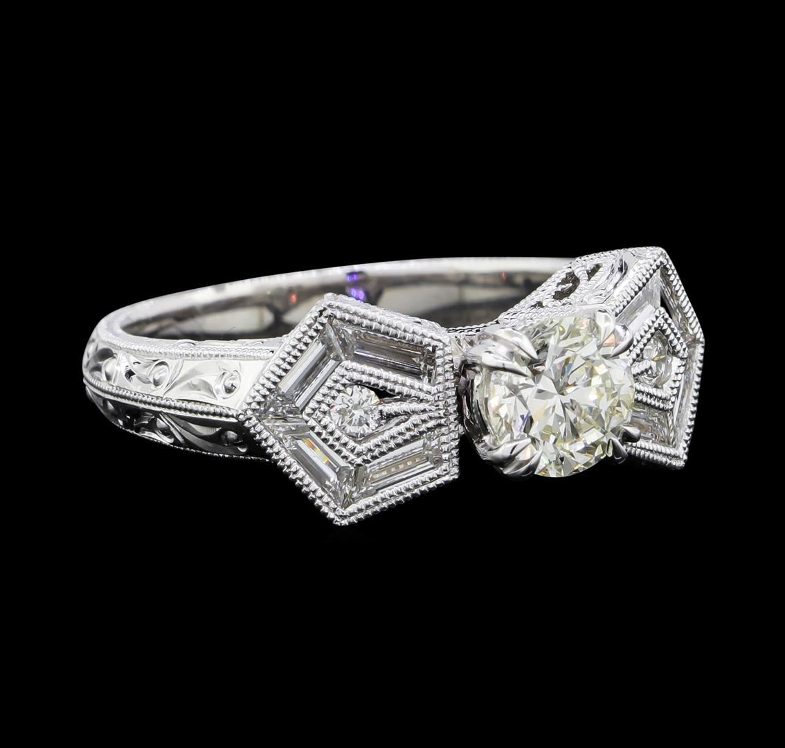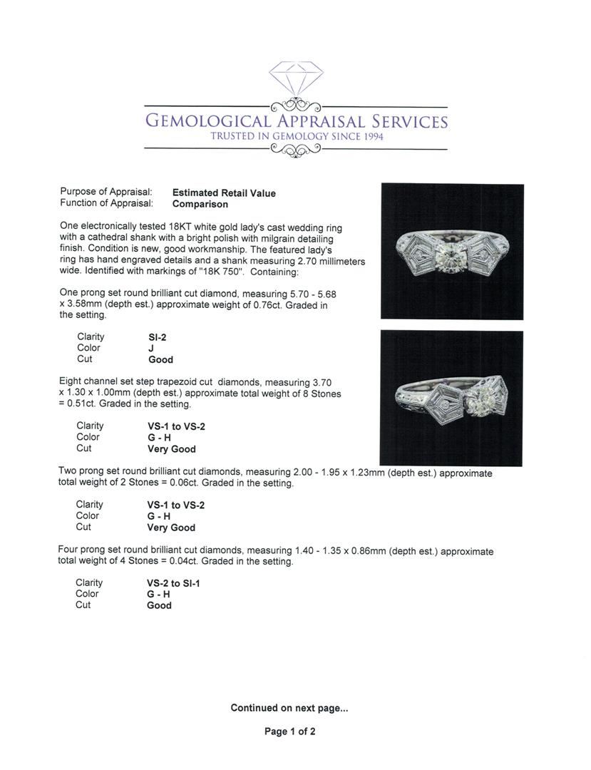 One electronically tested 18KT white gold lady's cast wedding ring with a cathedral shank with a bright polish with milgrain detailing finish. The featured lady's ring has hand engraved details and a shank measuring 2.70 millimeters wide. Identified with markings of '18K 750'. Condition is new, good workmanship. Containing: One prong set round brilliant cut diamond, measuring 5.70 - 5.68 x 3.58mm (depth est.) approximate weight of 0.76ct. Graded in the setting. Clarity SI-2. Color: J Cut Good Eight channel set step trapezoid cut diamonds, measuring 3.70 x 1.30 x 1.00mm (depth est.) approximate total weight of 8 Stones = 0.51ct. Graded in the setting. Clarity VS-1 to VS-2. Color: G - H Cut Very Good Two prong set round brilliant cut diamonds, measuring 2.00 - 1.95 x 1.23mm (depth est.) approximate total weight of 2 Stones = 0.06ct. Graded in the setting. Clarity VS-1 to VS-2. Color: G - H Cut Very Good Four prong set round brilliant cut diamonds, measuring 1.40 - 1.35 x 0.86mm (depth est.) approximate total weight of 4 Stones = 0.04ct. Graded in the setting. Clarity VS-2 to SI-1. Color: G - H Cut Good. Total Weight of Diamonds 1.37ct.. Total Weight of Ring 6.10gm. GAS Appraised at $8,270.00.