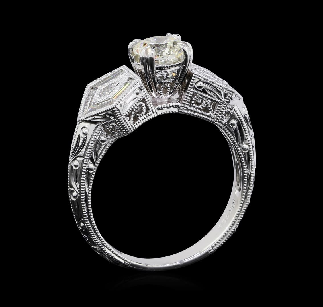 One electronically tested 18KT white gold lady's cast wedding ring with a cathedral shank with a bright polish with milgrain detailing finish. The featured lady's ring has hand engraved details and a shank measuring 2.70 millimeters wide. Identified with markings of '18K 750'. Condition is new, good workmanship. Containing: One prong set round brilliant cut diamond, measuring 5.70 - 5.68 x 3.58mm (depth est.) approximate weight of 0.76ct. Graded in the setting. Clarity SI-2. Color: J Cut Good Eight channel set step trapezoid cut diamonds, measuring 3.70 x 1.30 x 1.00mm (depth est.) approximate total weight of 8 Stones = 0.51ct. Graded in the setting. Clarity VS-1 to VS-2. Color: G - H Cut Very Good Two prong set round brilliant cut diamonds, measuring 2.00 - 1.95 x 1.23mm (depth est.) approximate total weight of 2 Stones = 0.06ct. Graded in the setting. Clarity VS-1 to VS-2. Color: G - H Cut Very Good Four prong set round brilliant cut diamonds, measuring 1.40 - 1.35 x 0.86mm (depth est.) approximate total weight of 4 Stones = 0.04ct. Graded in the setting. Clarity VS-2 to SI-1. Color: G - H Cut Good. Total Weight of Diamonds 1.37ct.. Total Weight of Ring 6.10gm. GAS Appraised at $8,270.00.