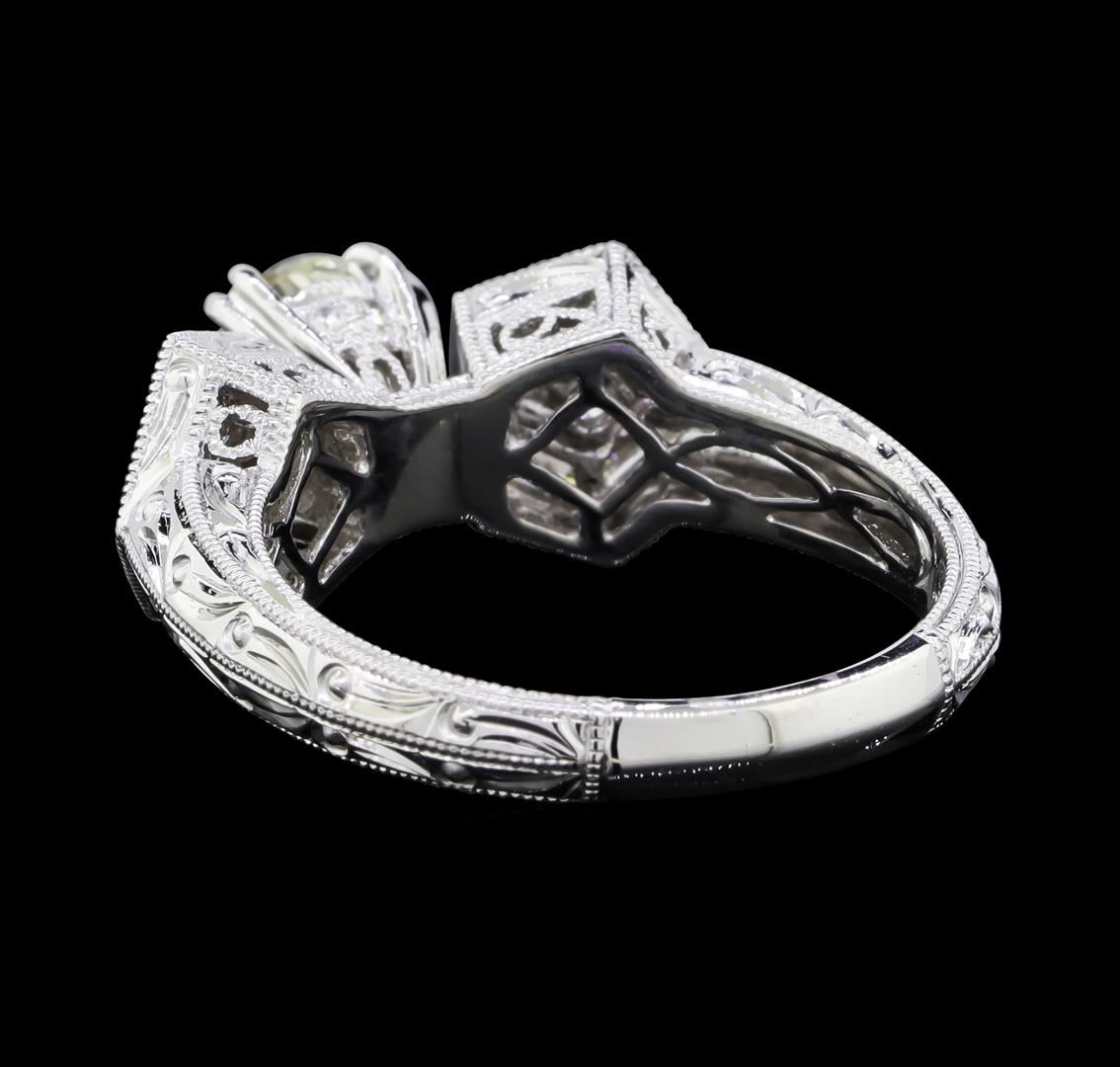 One electronically tested 18KT white gold lady's cast wedding ring with a cathedral shank with a bright polish with milgrain detailing finish. The featured lady's ring has hand engraved details and a shank measuring 2.70 millimeters wide. Identified with markings of '18K 750'. Condition is new, good workmanship. Containing: One prong set round brilliant cut diamond, measuring 5.70 - 5.68 x 3.58mm (depth est.) approximate weight of 0.76ct. Graded in the setting. Clarity SI-2. Color: J Cut Good Eight channel set step trapezoid cut diamonds, measuring 3.70 x 1.30 x 1.00mm (depth est.) approximate total weight of 8 Stones = 0.51ct. Graded in the setting. Clarity VS-1 to VS-2. Color: G - H Cut Very Good Two prong set round brilliant cut diamonds, measuring 2.00 - 1.95 x 1.23mm (depth est.) approximate total weight of 2 Stones = 0.06ct. Graded in the setting. Clarity VS-1 to VS-2. Color: G - H Cut Very Good Four prong set round brilliant cut diamonds, measuring 1.40 - 1.35 x 0.86mm (depth est.) approximate total weight of 4 Stones = 0.04ct. Graded in the setting. Clarity VS-2 to SI-1. Color: G - H Cut Good. Total Weight of Diamonds 1.37ct.. Total Weight of Ring 6.10gm. GAS Appraised at $8,270.00.