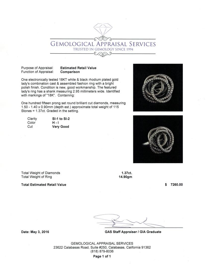 One electronically tested 18KT white & black rhodium plated gold lady's combination cast & assembled fashion ring with a bright polish finish. The featured lady's ring has a shank measuring 2.95 millimeters wide. Identified with markings of "18K". Condition is new, good workmanship. Containing: One Hundred Fifteen prong set round brilliant cut diamonds, measuring 1.50 - 1.40 x 0.90mm (depth est.) approximate total weight of 115 Stones = 1.37ct. Graded in the setting. Clarity: SI-1 to SI-2. Color: H - I. Cut Very Good. Total Weight of Diamonds 1.37ct. Total Weight of Ring 14.90gm GAS Appraised at $7,260.00.
