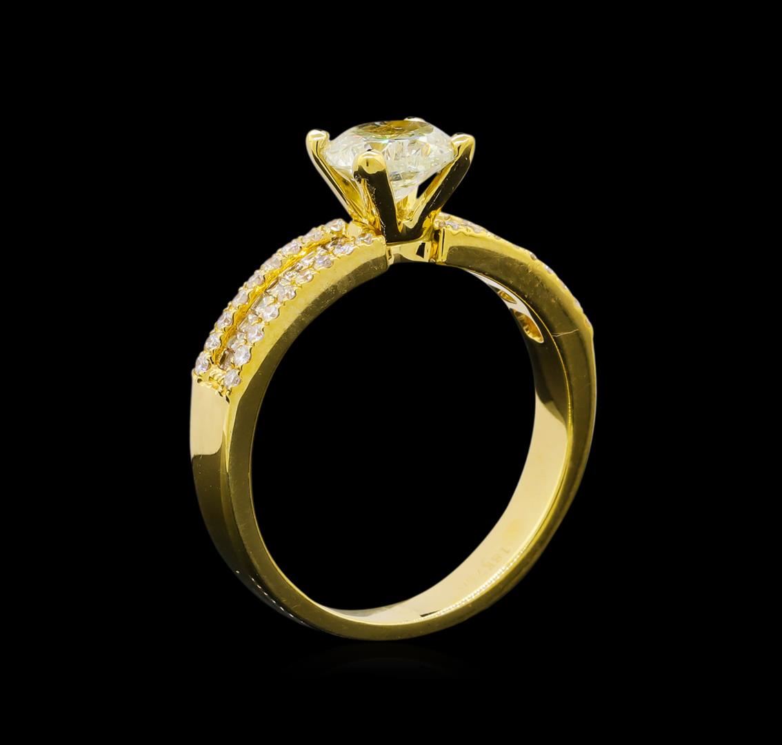 One electronically tested 18KT yellow gold ladies cast & assembled diamond unity ring with a bright finish. The featured diamond is set within mirroring diamond shoulders, completed by a three millimeter wide band. Identified with markings of "18K". Condition is new, good workmanship. Containing: One prong set round brilliant cut diamond, measuring 6.20 - 6.20 x 3.50mm (depth est.), 16.00.%. GTCF approximate weight of 0.97ct with a strong blue fluorescence. Graded in the setting. Clarity: I-2. Color: 56.5%. Table 69.4%. Fifty-Two channel and prong set round & baguette cut diamonds approximate total weight of 52 Stones = 0.40ct. Graded in the setting. Clarity: VS-2 to SI-2. Color: G - H. Total Weight of Diamonds 1.37ct. Total Weight of Ring 5.15gm. AIG Appraised at $9,400.00.