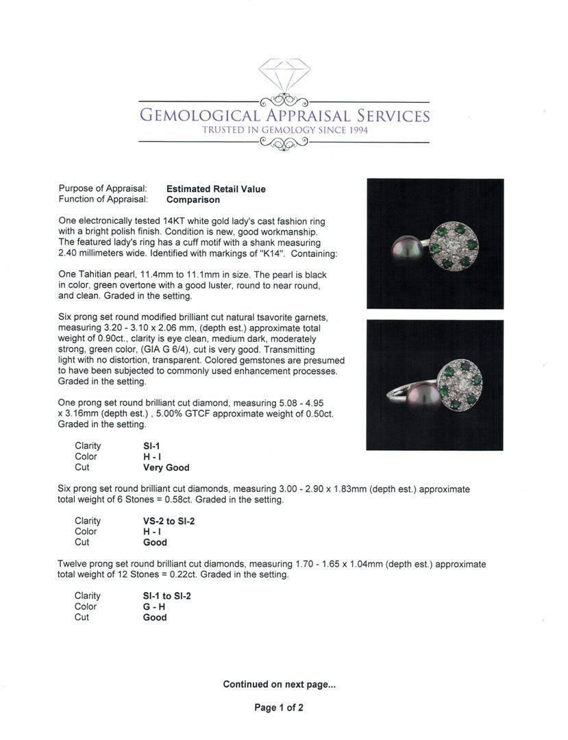 One electronically tested 14KT white gold lady's cast fashion ring with a bright polish finish. The featured lady's ring has a cuff motif with a shank measuring 2.40 millimeters wide. Identified with markings of "K14". Condition is new, good workmanship. Containing: One Tahitian pearl, 11.4mm to 11.1mm in size. The pearl is black in color, green overtone with a good luster, round to near round, and clean. Graded in the setting. Six prong set round modified brilliant cut natural tsavorite garnets, measuring 3.20 - 3.10 x 2.06 mm, (depth est.) approximate total weight of 0.90ct., clarity is eye clean, medium dark, moderately strong, green color, (GIA G 6/4), cut is very good. Transmitting light with no distortion, transparent. Colored gemstones are presumed to have been subjected to commonly used enhancement processes. Graded in the setting. One prong set round brilliant cut diamond, measuring 5.08 - 4.95 x 3.16mm (depth est.) , 5.00.%. GTCF approximate weight of 0.50ct. Graded in the setting. Clarity: SI-1. Color: H - I. Cut Very Good Six prong set round brilliant cut diamonds, measuring 3.00 - 2.90 x 1.83mm (depth est.) approximate total weight of 6 Stones = 0.58ct. Graded in the setting. Clarity: VS-2 to SI-2. Color: H - I. Cut Good Twelve prong set round brilliant cut diamonds, measuring 1.70 - 1.65 x 1.04mm (depth est.) approximate total weight of 12 Stones = 0.22ct. Graded in the setting. Clarity: SI-1 to SI-2. Color: G - Good Six prong set round brilliant cut diamonds, measuring 1.50 - 1.40 x 0.90mm (depth est.) approximate total weight of 6 Stones = 0.07ct. Clarity: SI-1 to SI-2. Color: G - Good. Total Weight of Colored Stones 0.90ct. Total Weight of Diamonds 1.37ct. Total Weight of Ring 8.00gm. GAS Appraised at $8,355.00.