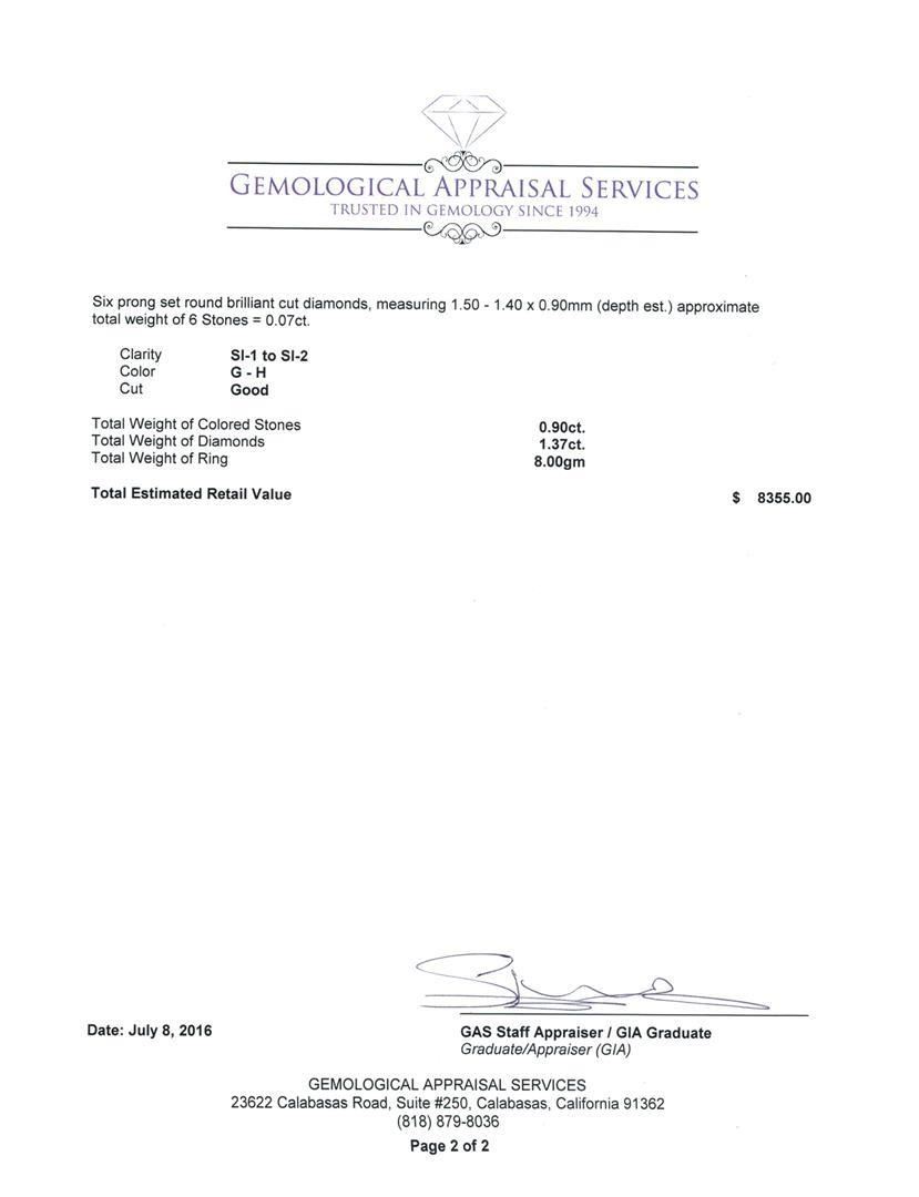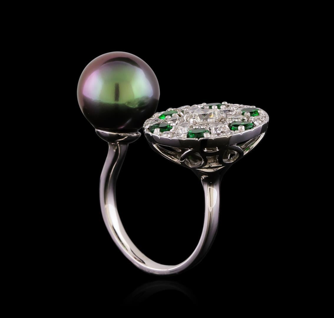 One electronically tested 14KT white gold lady's cast fashion ring with a bright polish finish. The featured lady's ring has a cuff motif with a shank measuring 2.40 millimeters wide. Identified with markings of "K14". Condition is new, good workmanship. Containing: One Tahitian pearl, 11.4mm to 11.1mm in size. The pearl is black in color, green overtone with a good luster, round to near round, and clean. Graded in the setting. Six prong set round modified brilliant cut natural tsavorite garnets, measuring 3.20 - 3.10 x 2.06 mm, (depth est.) approximate total weight of 0.90 ct., clarity is eye clean, medium dark, moderately strong, green color, (GIA G 6/4), cut is very good. Transmitting light with no distortion, transparent. Colored gemstones are presumed to have been subjected to commonly used enhancement processes. Graded in the setting. One prong set round brilliant cut diamond, measuring 5.08 - 4.95 x 3.16mm (depth est.) , 5.00.%. GTCF approximate weight of 0.50 ct. Graded in the setting. Clarity: SI-1. Color: H - I. Cut Very Good Six prong set round brilliant cut diamonds, measuring 3.00 - 2.90 x 1.83mm (depth est.) approximate total weight of 6 Stones = 0.58ct. Graded in the setting. Clarity: VS-2 to SI-2. Color: H - I. Cut Good Twelve prong set round brilliant cut diamonds, measuring 1.70 - 1.65 x 1.04mm (depth est.) approximate total weight of 12 Stones = 0.22ct. Graded in the setting. Clarity: SI-1 to SI-2. Color: G - Good Six prong set round brilliant cut diamonds, measuring 1.50 - 1.40 x 0.90mm (depth est.) approximate total weight of 6 Stones = 0.07ct. Clarity: SI-1 to SI-2. Color: G - Good. Total Weight of Colored Stones 0.90 ct. Total Weight of Diamonds 1.37ct. Total Weight of Ring 8.00gm. GAS Appraised.