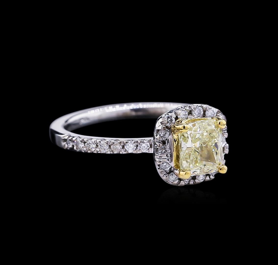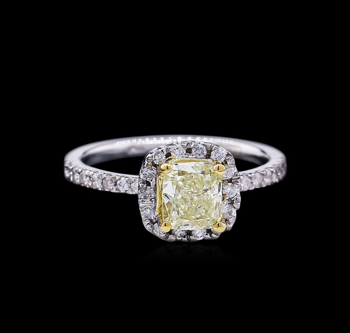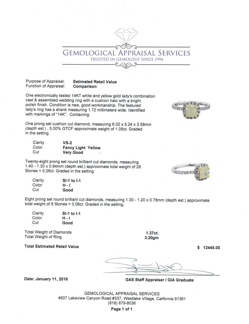 One electronically tested 14KT white and yellow gold lady's combination cast & assembled wedding ring with a cushion halo with a bright polish finish. The featured lady's ring has a shank measuring 1.72 millimeters wide. Identified with markings of "14K". Condition is new, good workmanship. Containing: One prong set cushion cut diamond, measuring 6.02 x 5.24 x 3.58mm (depth est.) , 5.00.%. GTCF approximate weight of 1.05ct. Graded in the setting. Clarity: VS-2 Cut Very Good Twenty-Eight prong set round brilliant cut diamonds, measuring 1.40 - 1.30 x 0.84mm (depth est.) approximate total weight of 28 Stones = 0.26ct. Graded in the setting. Clarity: SI-1 to I-1. Color: H - I. Cut Good Eight prong set round brilliant cut diamonds, measuring 1.30 - 1.20 x 0.78mm (depth est.) approximate total weight of 8 Stones = 0.06ct. Graded in the setting. Clarity: SI-1 to I-1. Color: H - I. Cut Good. Total Weight of Diamonds 1.37ct. Total Weight of Ring 3.20gm. GAS Appraised at $12,445.00.