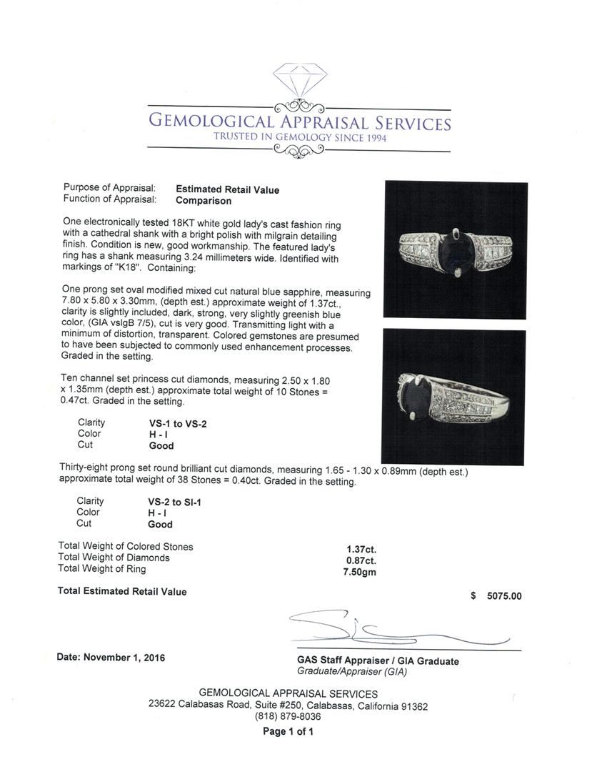 One electronically tested 18KT white gold lady's cast fashion ring with a cathedral shank with a bright polish with milgrain detailing finish. The featured lady's ring has a shank measuring 3.24 millimeters wide. Identified with markings of 'K18'. Condition is new, good workmanship. Containing: One prong set oval modified mixed cut natural blue sapphire, measuring 7.80 x 5.80 x 3.30mm, (depth est.) approximate weight of 1.37ct., clarity is slightly included, dark, strong, very slightly greenish blue color, (GIA vslgB 7/5), cut is very good. Transmitting light with a minimum of distortion, transparent. Colored gemstones are presumed to have been subjected to commonly used enhancement processes. Graded in the setting. Ten channel set princess cut diamonds, measuring 2.50 x 1.80 x 1.35mm (depth est.) approximate total weight of 10 Stones = 0.47ct. Graded in the setting. Clarity VS-1 to VS-2. Color: H - I Cut Good Thirty-Eight prong set round brilliant cut diamonds, measuring 1.65 - 1.30 x 0.89mm (depth est.) approximate total weight of 38 Stones = 0.40ct. Graded in the setting. Clarity VS-2 to SI-1. Color: H - I Cut Good. Total Weight of Colored Stones 1.37ct.. Total Weight of Diamonds 0.87ct.. Total Weight of Ring 7.50gm. GAS Appraised at $5,075.00.