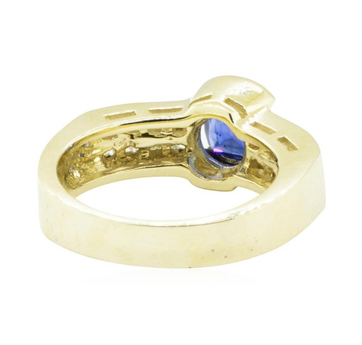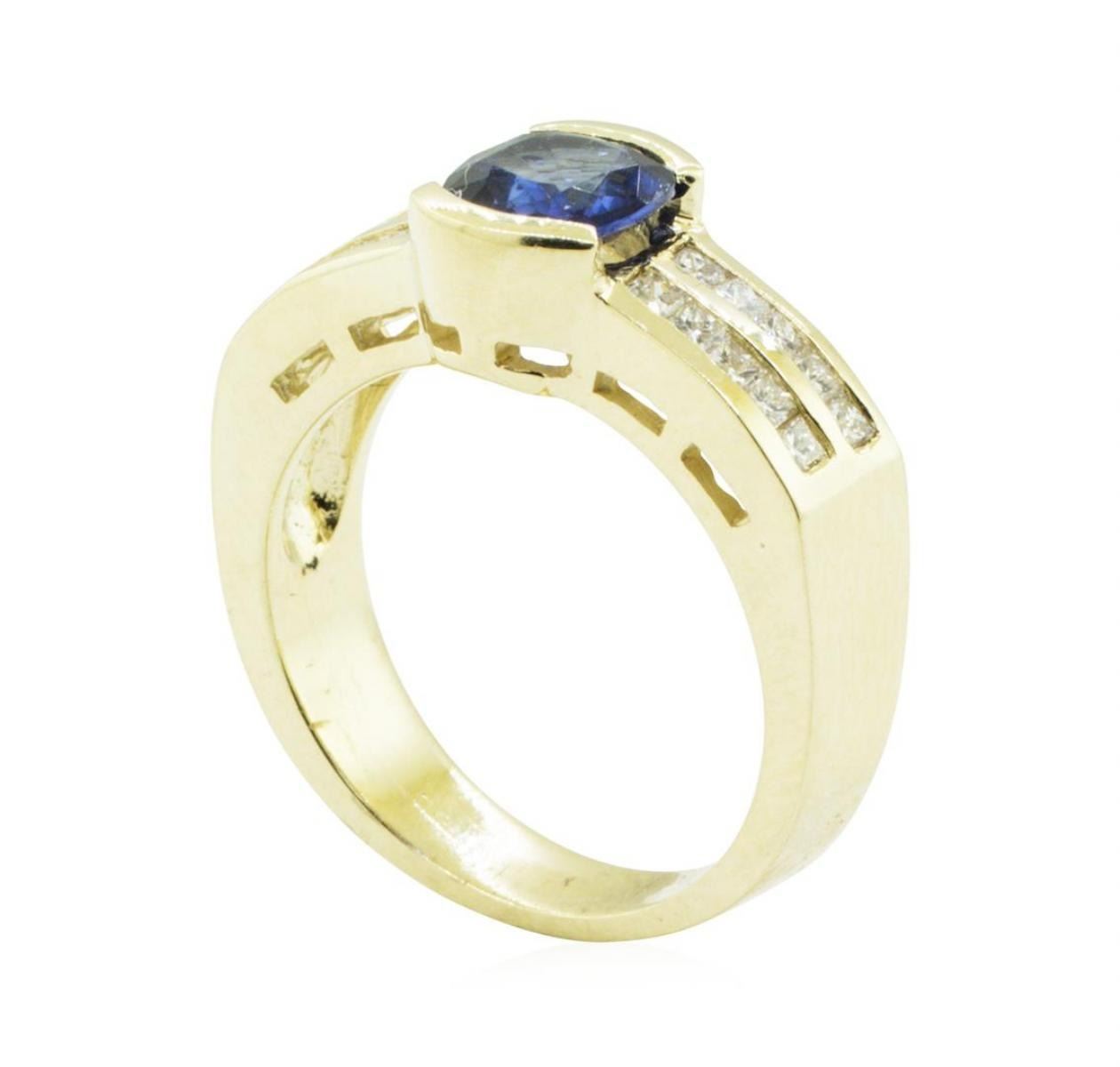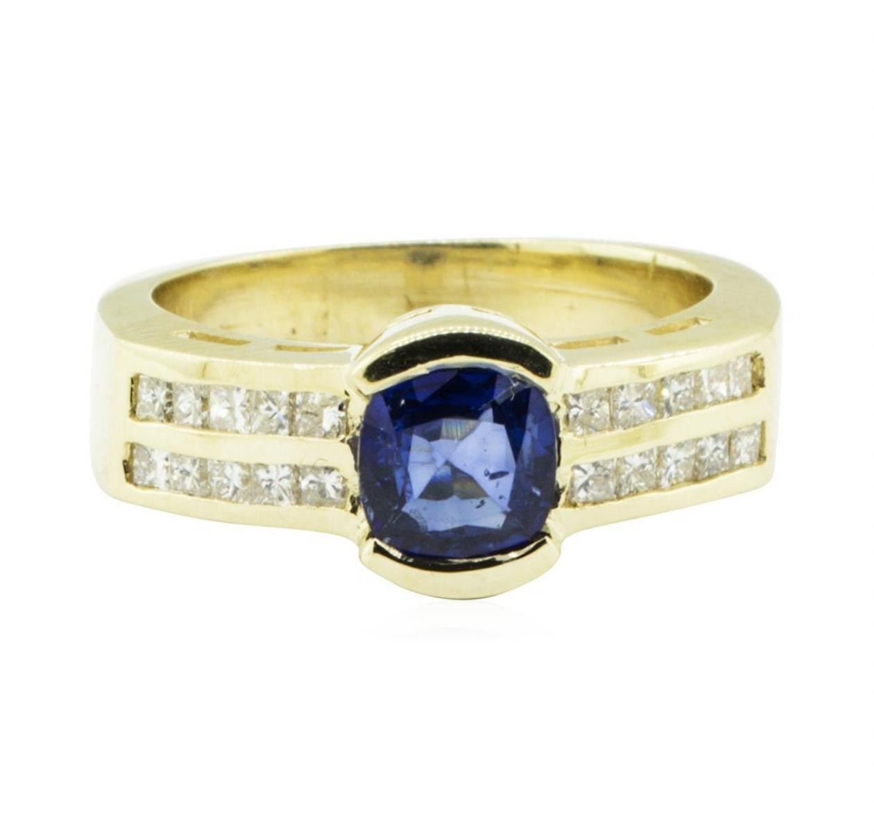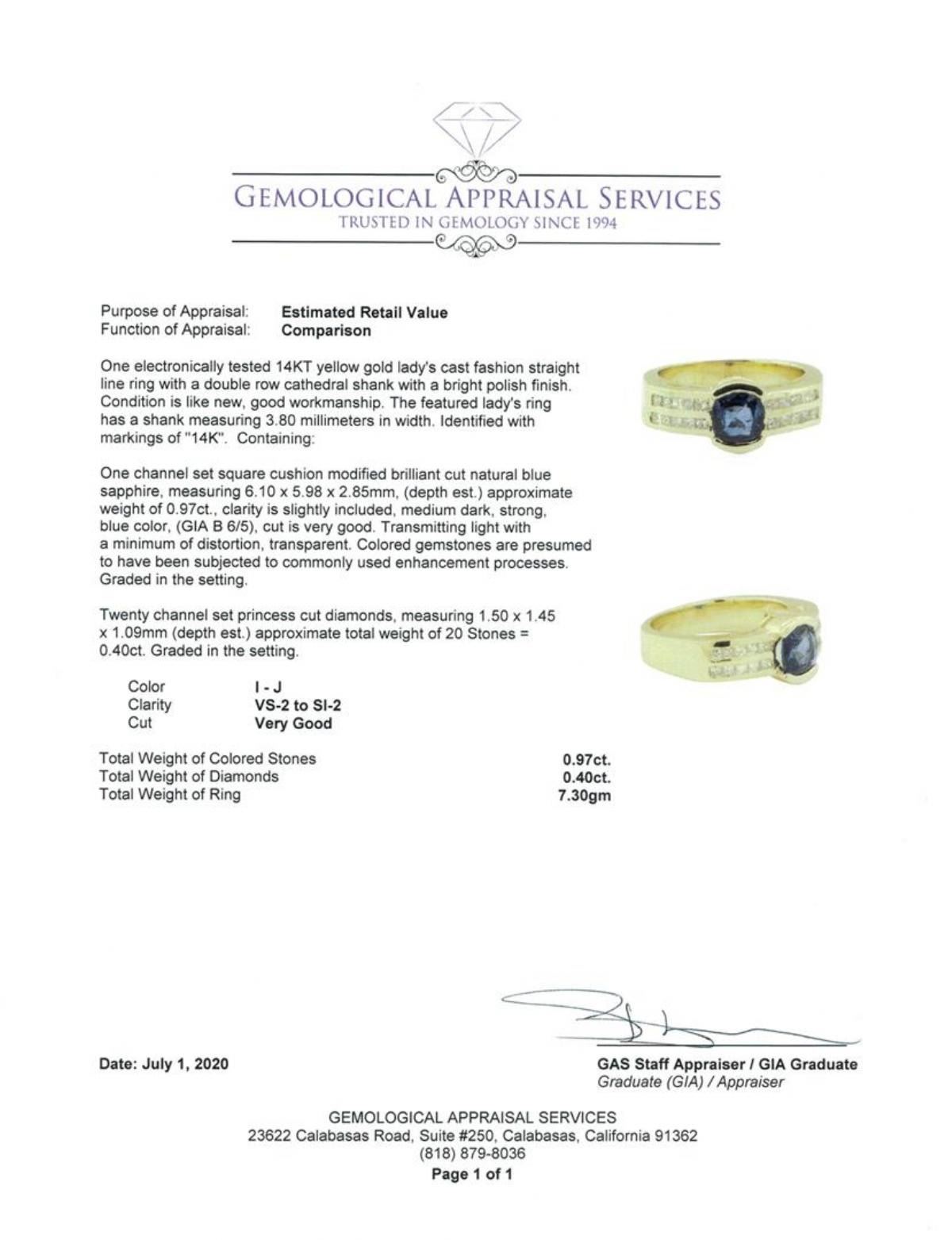 One electronically tested 14KT yellow gold lady's cast fashion straight line ring with a double row cathedral shank with a bright polish finish. The featured lady's ring has a shank measuring 3.80 millimeters in width. Identified with markings of '14K'. Condition is like new, good workmanship. Containing: One channel set square cushion modified brilliant cut natural blue sapphire, measuring 6.10 x 5.98 x 2.85mm, (depth est.) approximate weight of 0.97ct., clarity is slightly included, medium dark, strong, blue color, (GIA B 6/5), cut is very good. Transmitting light with a minimum of distortion, transparent. Colored gemstones are presumed to have been subjected to commonly used enhancement processes. Graded in the setting. Twenty channel set princess cut diamonds, measuring 1.50 x 1.45 x 1.09mm (depth est.) approximate total weight of 20 Stones = 0.40 ct. Graded in the setting. Color I - J Clarity VS-2 to SI-2 Cut Very Good. Total Weight of Colored Stones 0.97ct.. Total Weight of Diamonds 0.40 ct.. Total Weight of Ring 7.30gm GAS Appraised at $3440.00. GAS Appraised.