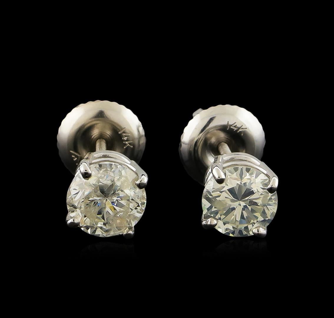 One pair electronically tested 14KT white gold cast & assembled diamond solitaire earrings with screw backs. Identified with markings of "14K". Condition is new, good workmanship. Containing: One prong set round brilliant cut diamond, measuring 5.50 - 5.40 x 3.30mm (depth est.), 3.00.%. GTCF approximate weight of 0.62ct with a faint green fluorescence. Graded in the setting. Clarity: I-1. Color: 60.6%. Table 62.4%. One prong set round brilliant cut diamond, measuring 5.75 - 5.65 x 3.70mm (depth est.), 2.00.%. GTCF approximate weight of 0.75ct with a faint blue fluorescence. Graded in the setting. Clarity: I-2. Color: I. Depth 64.9%. Table 61.1%. Total Weight of Diamonds 1.37ct. Total Weight of Earrings 1.10gm. AIG Appraised at $5,485.00.