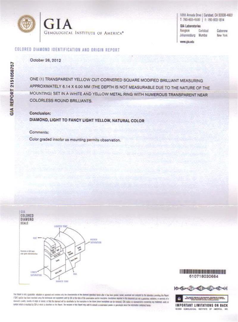 One ring featuring: 18KT white gold weighing 3.26 grams containing one fancy yellow diamond center stone with a total weight of 1.06ct and white diamond side stones with a total weight of 0.31ct. GIA Appraised.