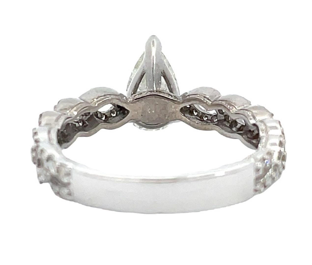 One electronically tested 14KT white gold lady's combination cast & assembled fashion twist motif wedding ring with a twist down the straightline shank with a bright polish with milgrain detailing finish. The featured lady's ring has a shank measuring 3.30 millimeters wide. Identified with markings of "14K". Condition is new, good workmanship. Containing: One prong set pear shaped cut diamond, measuring 9.00 x 5.35 x 3.37mm (depth est.) , 7.00% GTCF approximate weight of 1.00ct. Graded in the setting. Color H - I Clarity I-1 Cut Very Good Eighty prong set round brilliant cut diamonds, measuring 1.10 - 1.05 x 0.67mm (depth est.) approximate total weight of 80 Stones = 0.38ct. Graded in the setting. Color H - I Clarity VS-2 to SI-2 Cut Very Good Total Weight of Diamonds 1.38ct. Total Weight of Wedding Ring 3.70gm