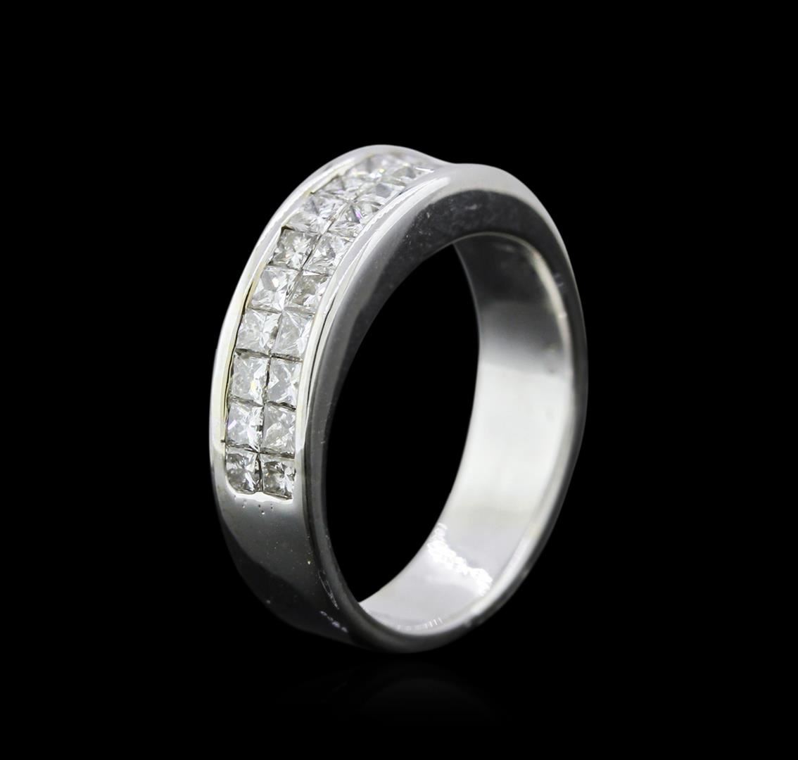 One electronically tested 18KT white gold ladies cast diamond wedding band with a bright polish finish. Identified with markings of "18K". Condition is new. Containing: Twenty-Eight invisible set princess cut diamonds, measuring 2.00 x 2.00 x 1.50mm (depth est.) approximate total weight of 28 Stones = 1.38ct. Clarity: VS-2 to SI-1. Color: H - I, Cut is Good. Diamonds are graded in the mounting, unless otherwise stated. Total Weight of Diamonds 1.38ct. Total Weight of Wedding Band 7.00gm. GGL Appraised at $3,290.00.