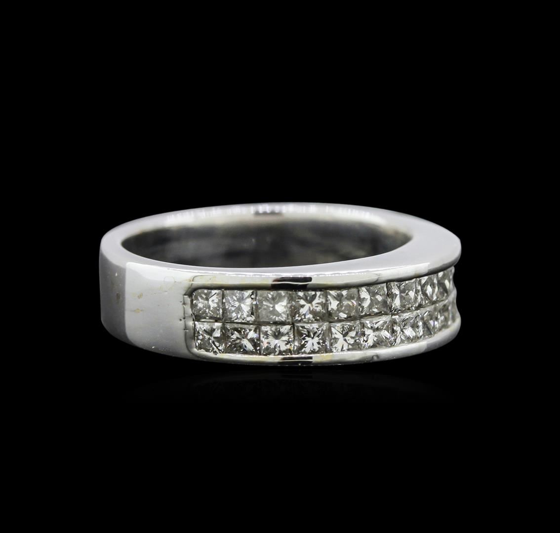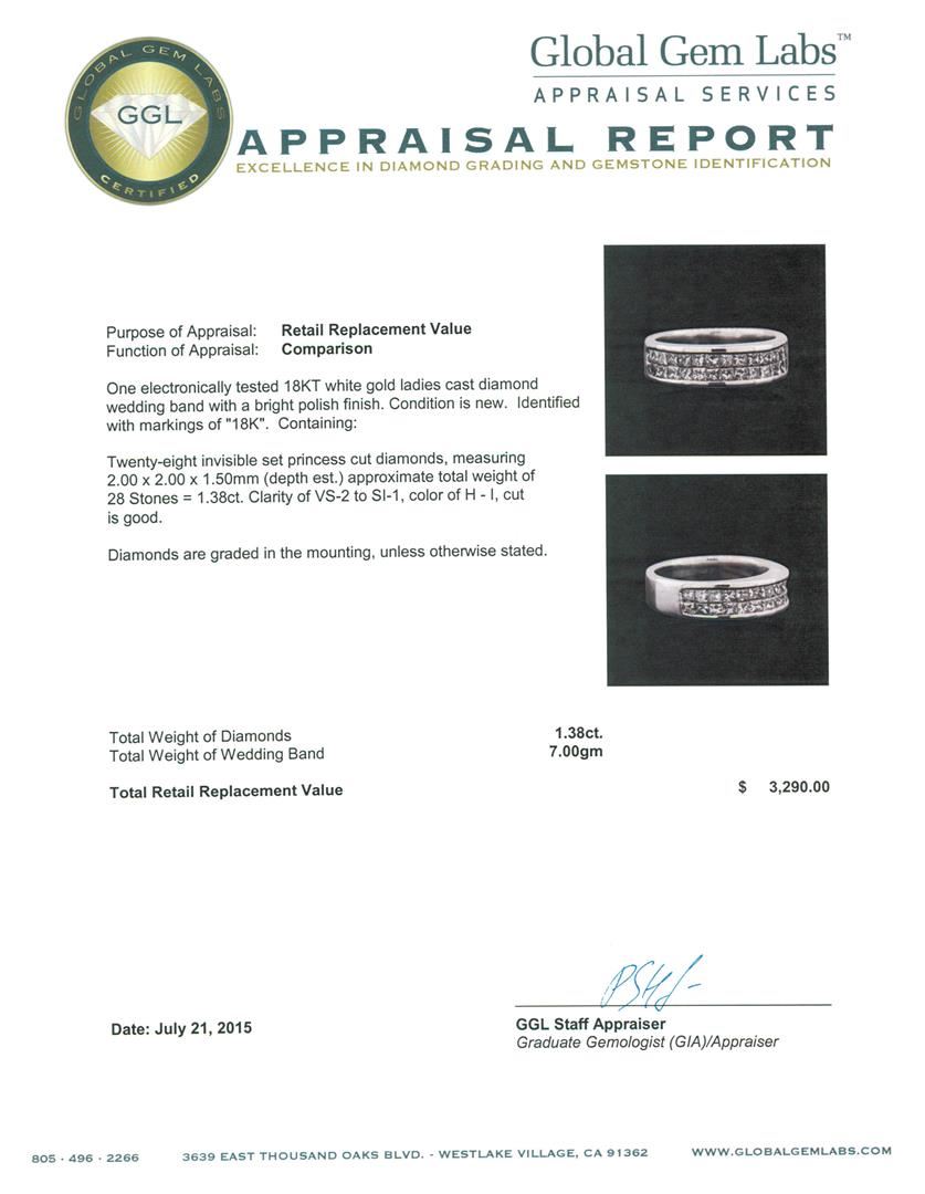 One electronically tested 18KT white gold ladies cast diamond wedding band with a bright polish finish. Identified with markings of "18K". Condition is new. Containing: Twenty-Eight invisible set princess cut diamonds, measuring 2.00 x 2.00 x 1.50mm (depth est.) approximate total weight of 28 Stones = 1.38ct. Clarity: VS-2 to SI-1. Color: H - I, Cut is Good. Diamonds are graded in the mounting, unless otherwise stated. Total Weight of Diamonds 1.38ct. Total Weight of Wedding Band 7.00gm. GGL Appraised at $3,290.00.