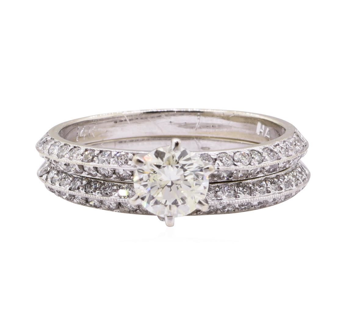 One set electronically tested 14KT white gold lady's combination cast & assembled wedding ring & wedding band with a knife edge shank with a bright polish with milgrain detailing finish. The featured lady's wedding set has a double shank measuring 4.22 millimeters wide. Identified with markings of '14K'. Condition is new, good workmanship. Containing: One prong set round brilliant cut diamond, measuring 5.60 - 5.54 x 3.51mm (depth est.) approximate weight of 0.67ct. Graded in the setting. Color I - J Clarity I-1 Cut Very Good Seventy-Six pave' set round brilliant cut diamonds, measuring 1.40 - 1.30 x 0.85mm (depth est.) approximate total weight of 76 Stones = 0.71ct. Graded in the setting. Color G - I Clarity SI-1 to I-1 Cut Good. Total Weight of Diamonds 1.38ct.. Total Weight of Ring & Wedding Band 4.10gm GAS Appraised at $5205.00. GAS Appraised.