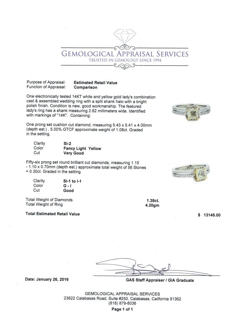 One electronically tested 14KT white and yellow gold lady's combination cast & assembled wedding ring with a split shank halo with a bright polish finish. The featured lady's ring has a shank measuring 2.62 millimeters wide. Identified with markings of "14K". Condition is new, good workmanship. Containing: One prong set cushion cut diamond, measuring 5.43 x 5.41 x 4.00mm (depth est.) , 5.00.%. GTCF approximate weight of 1.08ct. Graded in the setting. Clarity: SI-2 Cut Very Good Fifty-Six prong set round brilliant cut diamonds, measuring 1.15 - 1.10 x 0.70mm (depth est.) approximate total weight of 56 Stones = 0.30ct. Graded in the setting. Clarity: SI-1 to I-1. Color: G - I. Cut Good. Total Weight of Diamonds 1.38ct. Total Weight of Ring 4.20gm. GAS Appraised at $13,145.00.