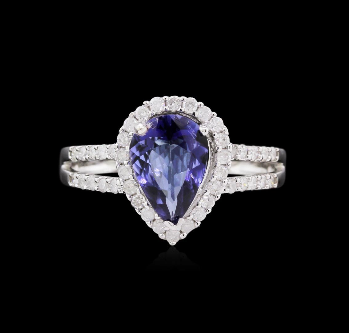 One electronically tested 14KT white gold ladies cast tanzanite and diamond ring with a bright polish finish. The featured tanzanite is set within a diamond bezel supported by diamond set split shoulders, completed by a two millimeter wide band. Trademark is Orianne. Identified with markings of "14K". Condition is new, good workmanship. Containing: One prong set pear mixed cut natural tanzanite, measuring 10.00 x 6.90 x 3.25mm, approximate weight of 1.38ct., clarity is eye clean, type I, dark, very slightly grayish, blue color, (GIA B 7/3), cut is good. Natural Tanzanite, color enhanced due to cobalt coating. The presence of the coating prevents determining the stone's actual depth of color. Transmitting light with no distortion, transparent. Grading in the setting. The cobalt coated Tanzanite has a low tolerance to ultrasonic cleaning, and should not be cleaned using this method. Tanzanite is a very rare gemstone that is only found in the country of Tanzania. Originally discovered in 1967. Tiffany & Company, named the stone Tanzanite. It is found in the Usumburu Mountains that border the Umba Valley of northern Tanzania. Tanzanite occurs in gray, brown, violet, blue, reddish-purple, & green. The gem is interesting because of its exceptional pleochroism. Rotated in different directions a tanzanite will exhibit multiple changes of color. Forty-Two prong set round brilliant cut diamonds, measuring 1.40 - 1.30 x 0.81mm (depth est.) approximate total weight of 42 Stones = 0.42ct. Graded in the setting. Clarity: I-2 to I-3. Color: G - I. Total Weight of Colored Stones 1.38ct. Total Weight of Diamonds 0.42ct. AIG Appraised at $2,100.00.