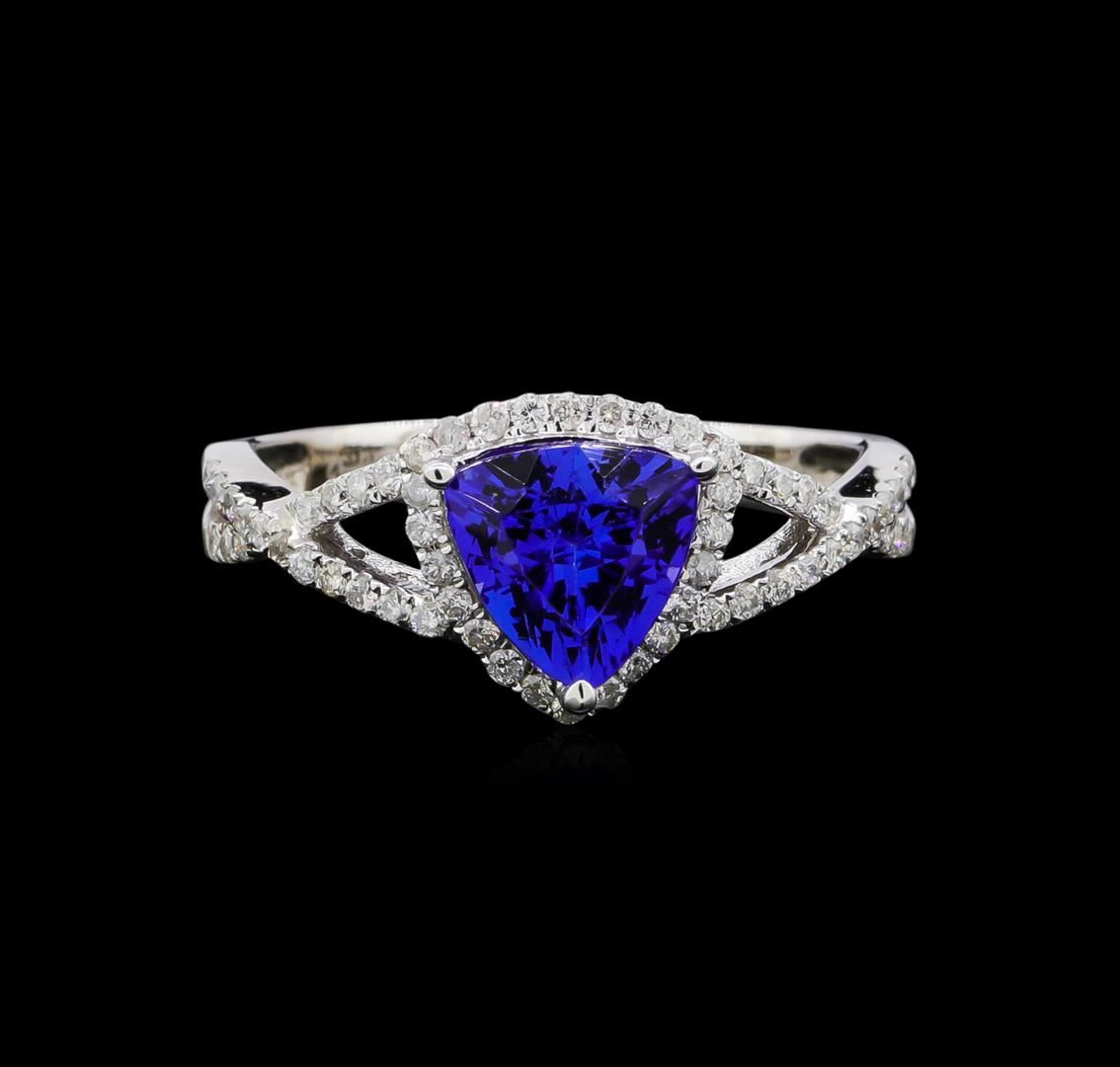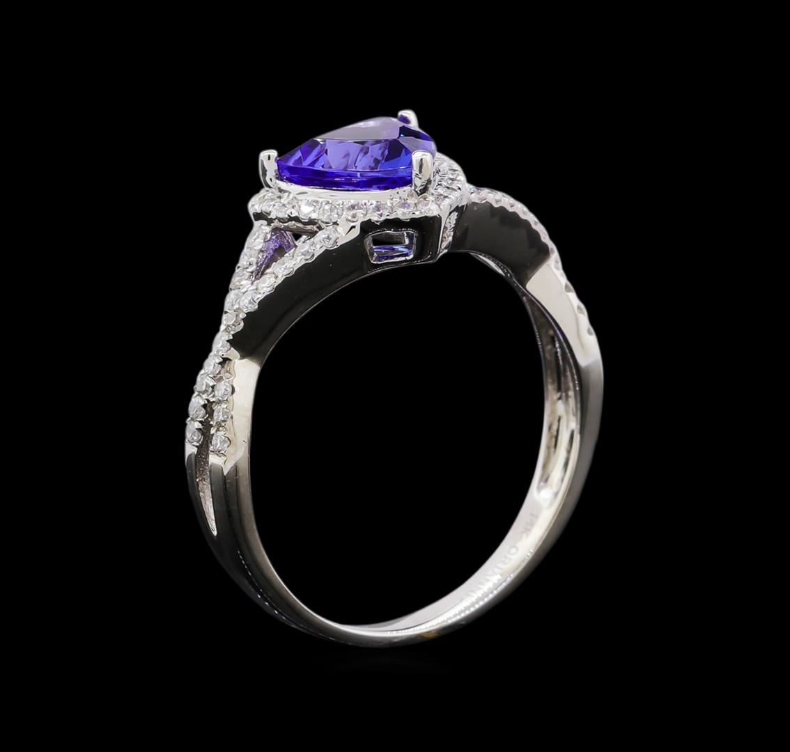 One electronically tested 14KT white gold ladies cast tanzanite and diamond ring with a bright polish finish. The featured tanzanite is set within a diamond bezel supported by intertwining diamond set shoulders, completed by a two millimeter wide band. Trademark is Orianne. Identified with markings of "14K". Condition is new, good workmanship. Containing: One prong set triangle mixed cut natural tanzanite approximate weight of 1.38ct., clarity is eye clean, type I, medium dark, very slightly grayish, violetish blue color, (GIA vB 6/3), cut is good. Transmitting light with no distortion, transparent. Graded in the setting. Tanzanite is a very rare gemstone that is only found in the country of Tanzania. Originally discovered in 1967. Tiffany & Company, named the stone Tanzanite. It is found in the Usumburu Mountains that border the Umba Valley of northern Tanzania. Tanzanite occurs in gray, brown, violet, blue, reddish-purple, & green. The gem is interesting because of its exceptional pleochroism. Rotated in different directions a tanzanite will exhibit multiple changes of color. Tanzanite has a low tolerance to ultrasonic cleaning, and should not be cleaned using this method. Sixty prong set round brilliant cut diamonds approximate total weight of 60 Stones = 0.32ct. Graded in the setting. Clarity: I-1 to I-2. Color: G - I. Total Weight of Colored Stones 1.38ct. Total Weight of Diamonds 0.32ct. Total Weight of Ring 3.07gm. AIG Appraised at $4,215.00.