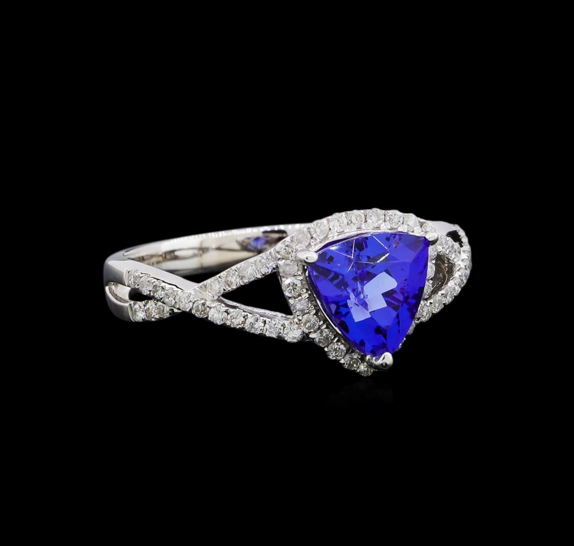 One electronically tested 14KT white gold ladies cast tanzanite and diamond ring with a bright polish finish. The featured tanzanite is set within a diamond bezel supported by intertwining diamond set shoulders, completed by a two millimeter wide band. Trademark is Orianne. Identified with markings of "14K". Condition is new, good workmanship. Containing: One prong set triangle mixed cut natural tanzanite approximate weight of 1.38ct., clarity is eye clean, type I, medium dark, very slightly grayish, violetish blue color, (GIA vB 6/3), cut is good. Transmitting light with no distortion, transparent. Graded in the setting. Tanzanite is a very rare gemstone that is only found in the country of Tanzania. Originally discovered in 1967. Tiffany & Company, named the stone Tanzanite. It is found in the Usumburu Mountains that border the Umba Valley of northern Tanzania. Tanzanite occurs in gray, brown, violet, blue, reddish-purple, & green. The gem is interesting because of its exceptional pleochroism. Rotated in different directions a tanzanite will exhibit multiple changes of color. Tanzanite has a low tolerance to ultrasonic cleaning, and should not be cleaned using this method. Sixty prong set round brilliant cut diamonds approximate total weight of 60 Stones = 0.32ct. Graded in the setting. Clarity: I-1 to I-2. Color: G - I. Total Weight of Colored Stones 1.38ct. Total Weight of Diamonds 0.32ct. Total Weight of Ring 3.07gm. AIG Appraised at $4,215.00.