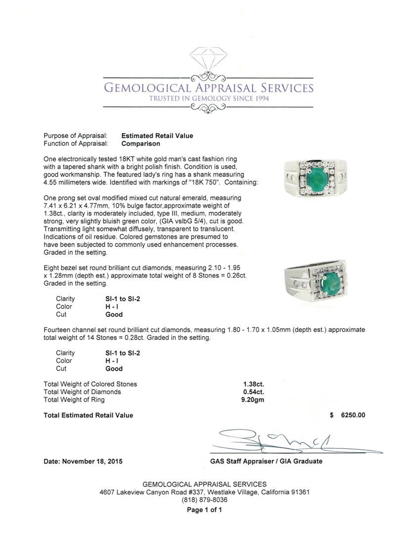 One electronically tested 18KT white gold man's cast fashion ring with a tapered shank with a bright polish finish. The featured lady's ring has a shank measuring 4.55 millimeters wide. Identified with markings of "18K 750". Condition is used, good workmanship. Containing: One prong set oval modified mixed cut natural emerald, measuring 7.41 x 6.21 x 4.77mm, 10%. bulge factor, approximate weight of 1.38ct., clarity is moderately included, type III, medium, moderately strong, very slightly bluish green color, (GIA vslbG 5/4), cut is good. Transmitting light somewhat diffusely, transparent to translucent. Indications of oil residue. Colored gemstones are presumed to have been subjected to commonly used enhancement processes. Graded in the setting. Eight bezel set round brilliant cut diamonds, measuring 2.10 - 1.95 x 1.28mm (depth est.) approximate. Total Weight of 8 Stones = 0.26ct. Graded in the setting. Clarity: SI-1 to SI-2. Color: H - I. Cut Good Fourteen channel set round brilliant cut diamonds, measuring 1.80 - 1.70 x 1.05mm (depth est.) approximate. Total Weight of 14 Stones = 0.28ct. Graded in the setting. Clarity: SI-1 to SI-2. Color: H - I. Cut Good. Total Weight of Colored Stones 1.38ct. Total Weight of Diamonds 0.54ct. Total Weight of Ring 9.20gm. GAS Appraised.