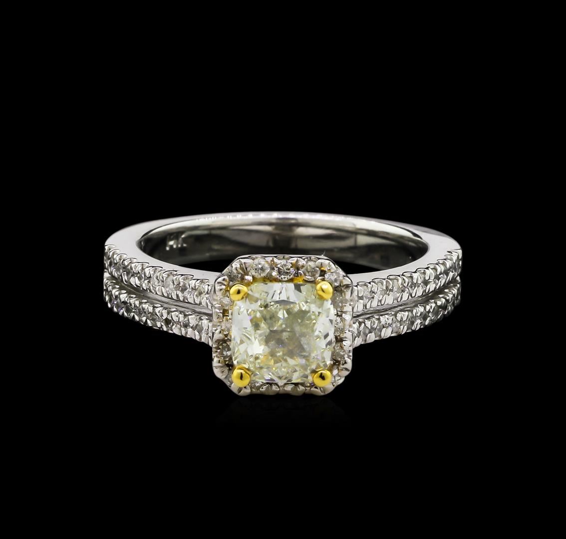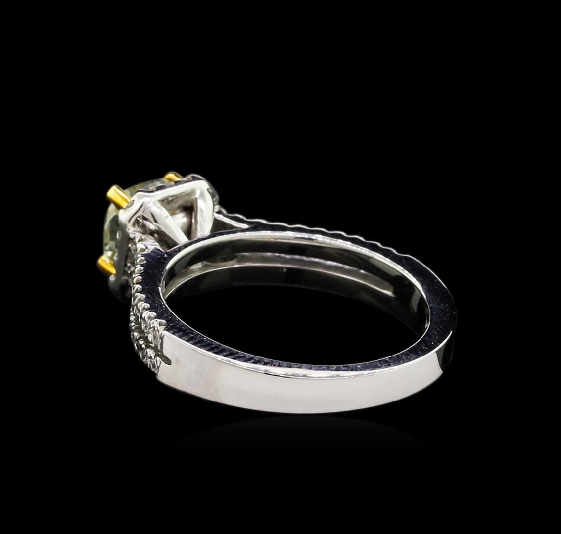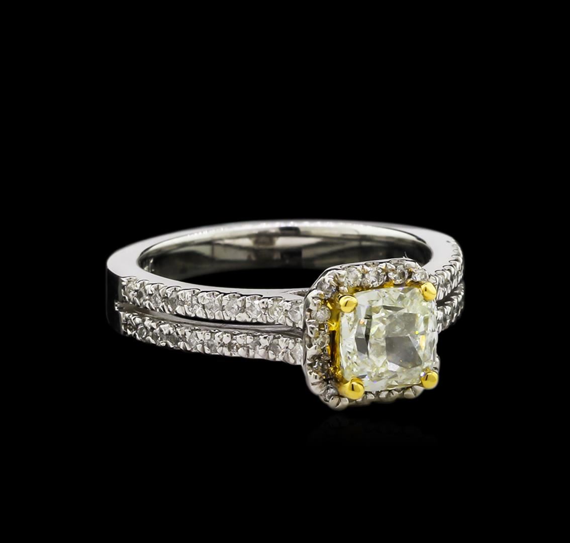 One electronically tested 14KT white and yellow gold lady's combination cast & assembled wedding ring with a split shank halo with a bright polish finish. The featured lady's ring has a shank measuring 2.62 millimeters wide. Identified with markings of "14K". Condition is new, good workmanship. Containing: One prong set cushion cut diamond, measuring 5.43 x 5.41 x 4.00mm (depth est.) , 5.00.%. GTCF approximate weight of 1.08ct. Graded in the setting. Clarity: SI-2 Cut Very Good Fifty-Six prong set round brilliant cut diamonds, measuring 1.15 - 1.10 x 0.70mm (depth est.) approximate total weight of 56 Stones = 0.30ct. Graded in the setting. Clarity: SI-1 to I-1. Color: G - I. Cut Good. Total Weight of Diamonds 1.38ct. Total Weight of Ring 4.20gm. GAS Appraised at $13,145.00.