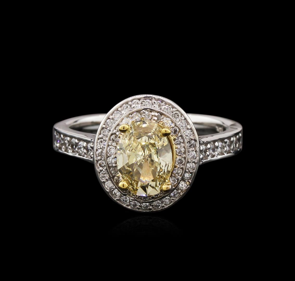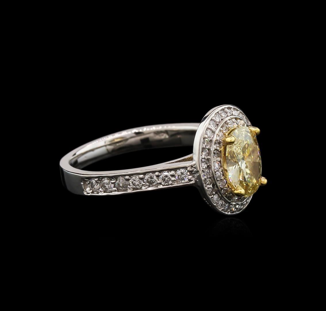 One electronically tested 14KT white and yellow gold lady's combination cast & assembled double halo ring with a cathedral shank with a bright polish finish. The featured lady's ring has a shank measuring 2.41 millimeters wide. Identified with markings of "14K". Condition is new, good workmanship. Containing: One prong set oval shaped cut diamond, measuring 7.77 x 5.67 x 3.57mm (depth est.) approximate weight of 1.00ct. Graded in the setting. Clarity: VS-2 Cut Good Fourteen prong set round brilliant cut diamonds, measuring 1.70 - 1.60 x 0.99mm (depth est.) approximate total weight of 14 Stones = 0.23ct. Graded in the setting. Clarity: SI-1 to SI-2. Color: H - I. Cut Good Forty-Eight bead set round brilliant cut diamonds, measuring 0.95 - 0.90 x 0.61mm (depth est.) approximate total weight of 48 Stones = 0.15ct. Graded in the setting. Clarity: VS-2 to SI-1. Color: H - I. Cut Good. Total Weight of Diamonds 1.38ct. Total Weight of Ring 3.80gm. GAS Appraised at $17,820.00.