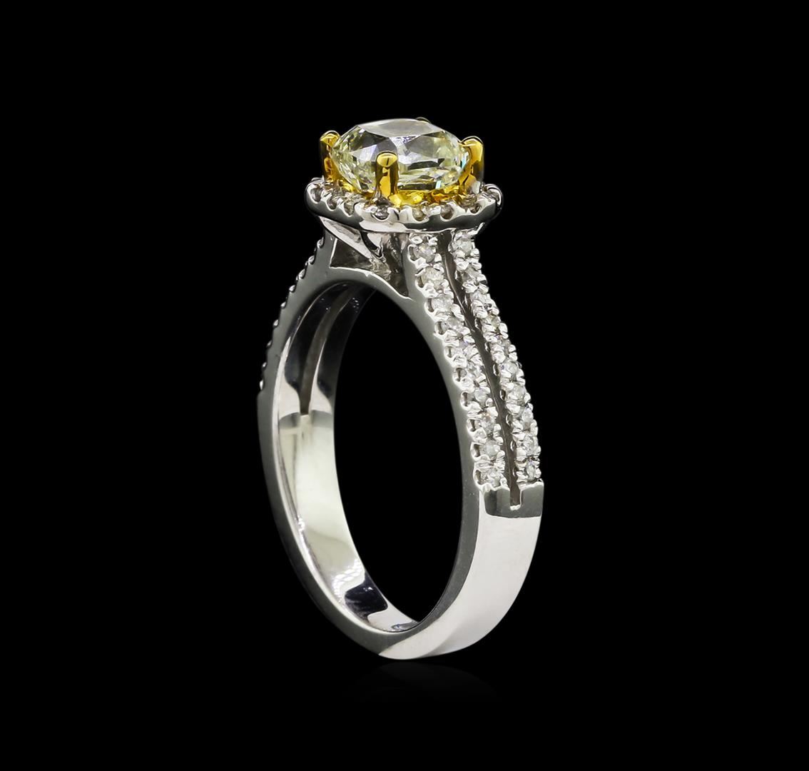 One electronically tested 14KT white and yellow gold lady's combination cast & assembled wedding ring with a split shank halo with a bright polish finish. The featured lady's ring has a shank measuring 2.62 millimeters wide. Identified with markings of "14K". Condition is new, good workmanship. Containing: One prong set cushion cut diamond, measuring 5.43 x 5.41 x 4.00mm (depth est.) , 5.00.%. GTCF approximate weight of 1.08ct. Graded in the setting. Clarity: SI-2 Cut Very Good Fifty-Six prong set round brilliant cut diamonds, measuring 1.15 - 1.10 x 0.70mm (depth est.) approximate total weight of 56 Stones = 0.30ct. Graded in the setting. Clarity: SI-1 to I-1. Color: G - I. Cut Good. Total Weight of Diamonds 1.38ct. Total Weight of Ring 4.20gm. GAS Appraised at $13,145.00.