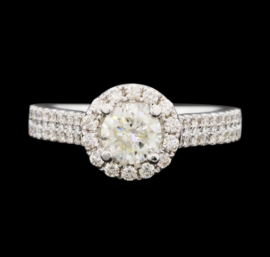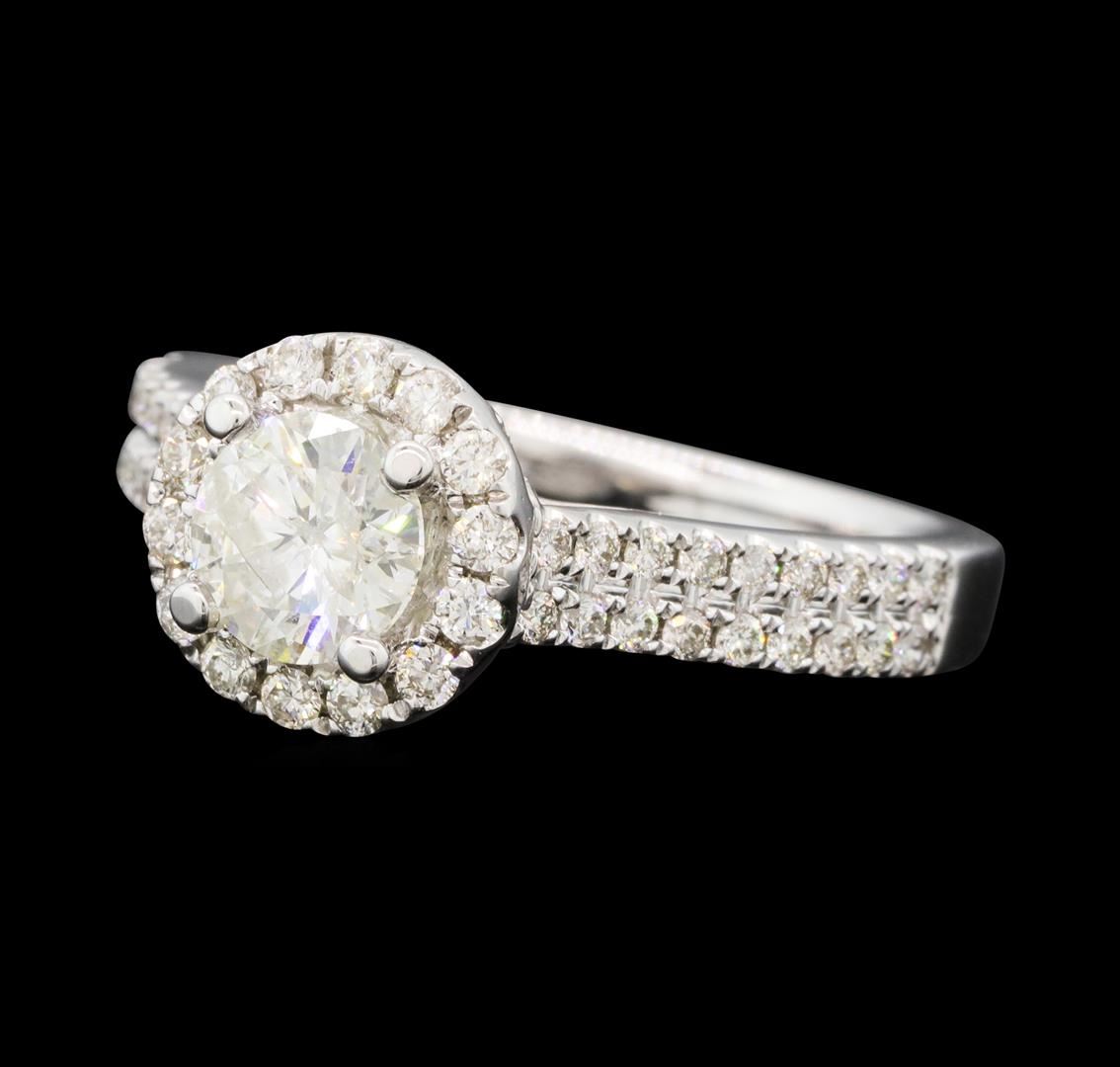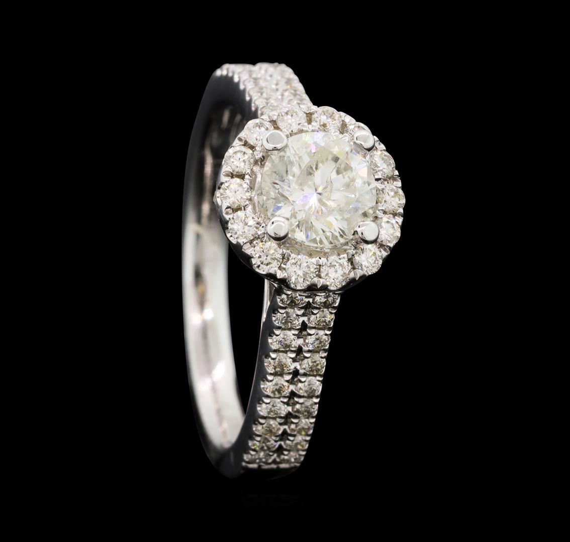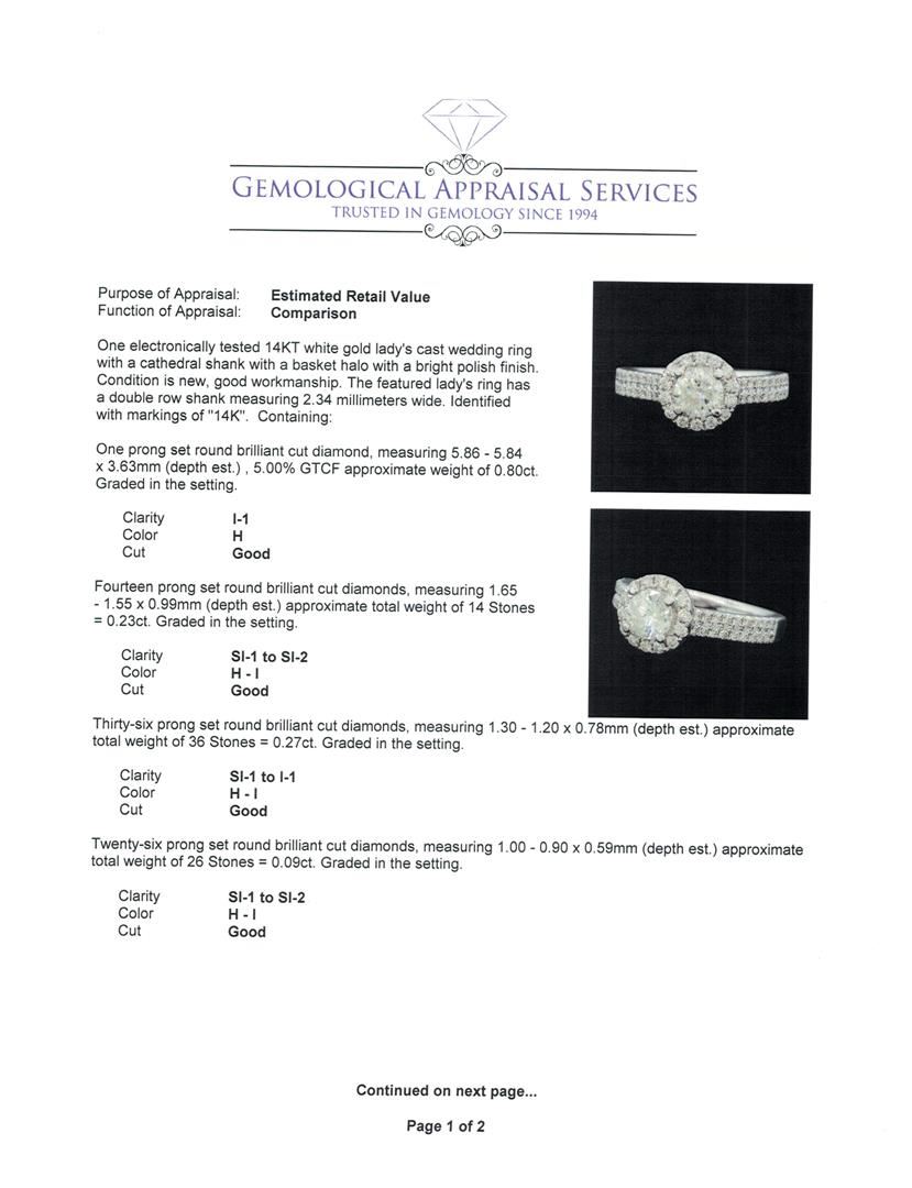 One electronically tested 14KT white gold lady's cast wedding ring with a cathedral shank with a basket halo with a bright polish finish. The featured lady's ring has a double row shank measuring 2.34 millimeters wide. Identified with markings of '14K'. Condition is new, good workmanship. Containing: One prong set round brilliant cut diamond, measuring 5.86 - 5.84 x 3.63mm (depth est.) , 5.00.%. GTCF approximate weight of 0.80ct. Graded in the setting. Color H Clarity I-1 Cut Good Fourteen prong set round brilliant cut diamonds, measuring 1.65 - 1.55 x 0.99mm (depth est.) approximate total weight of 14 Stones = 0.23ct. Graded in the setting. Color H - I Clarity SI-1 to SI-2 Cut Good Thirty-Six prong set round brilliant cut diamonds, measuring 1.30 - 1.20 x 0.78mm (depth est.) approximate total weight of 36 Stones = 0.27ct. Graded in the setting. Color H - I Clarity SI-1 to I-1 Cut Good Twenty-Six prong set round brilliant cut diamonds, measuring 1.00 - 0.90 x 0.59mm (depth est.) approximate total weight of 26 Stones = 0.09ct. Graded in the setting. Color H - I Clarity SI-1 to SI-2 Cut Good. Total Weight of Diamonds 1.39ct.. Total Weight of Ring 4.40gm GAS Appraised at $7,935.00.