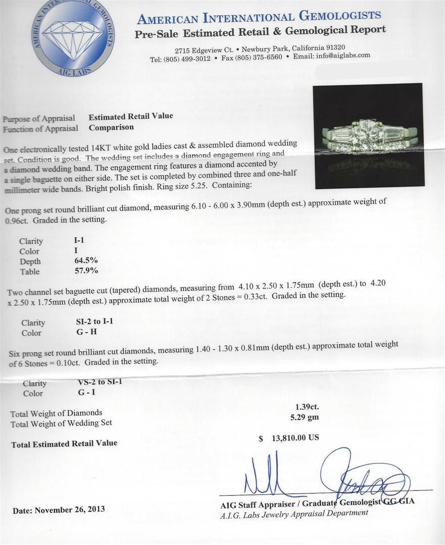 One electronically tested 14KT white gold ladies cast & assembled diamond wedding set. Condition is good. The wedding set includes a diamond engagement ring and a diamond wedding band. The engagement ring features a diamond accented by a single baguette on either side. The set is completed by a combined three and one-half millimeter wide bands. Bright polish finish. Ring size is 5.25. Containing: One prong set round brilliant cut diamond, measuring 6.10 - 6.00 x 3.90mm (depth est.) approximate weight of 0.96ct. Graded in the setting. Clarity: I-1. Color: I. Depth: 64.5%. Table: 57.9%. Two channel set baguette cut (tapered) diamonds, measuring from 4.10 x 2.50 x 1.75mm (depth est.) to 4.20 x 2.50 x 1.75mm (depth est.) approximate total weight of 2 Stones = 0.33ct. Graded in the setting. Clarity: SI-2 to I-1. Color: G - H. Six prong set round brilliant cut diamonds, measuring 1.40 - 1.30 x 0.81mm (depth est.) approximate total weight of 6 Stones = 0.10ct. Graded in the setting. Clarity: VS-2 to SI-1. Color: G - H. Total Weight of Diamonds 1.39ct. Total Weight of Wedding Set 5.29gm. AIG Appraised at $13,810.00.