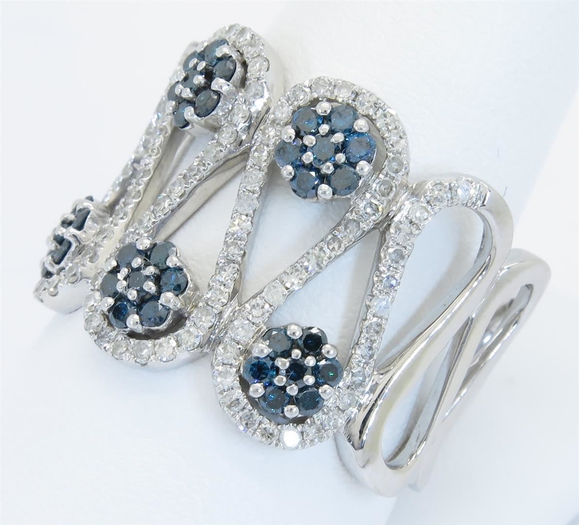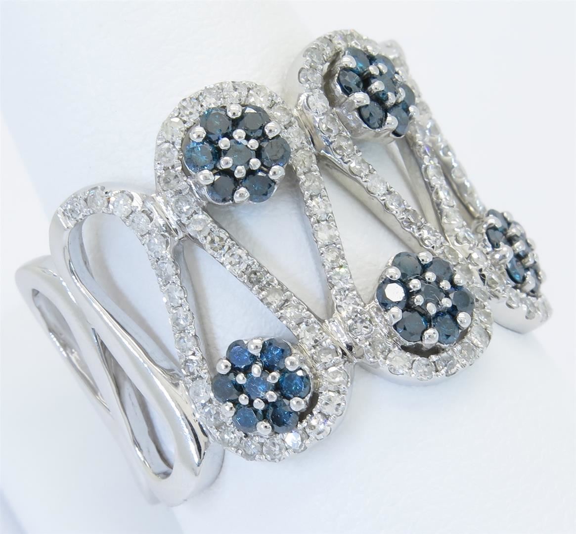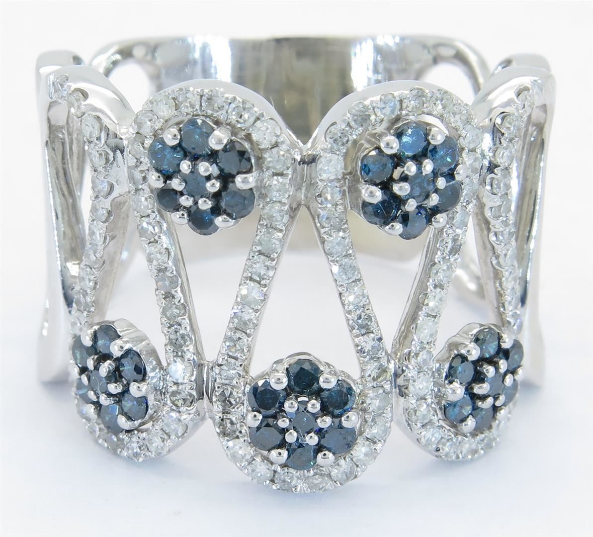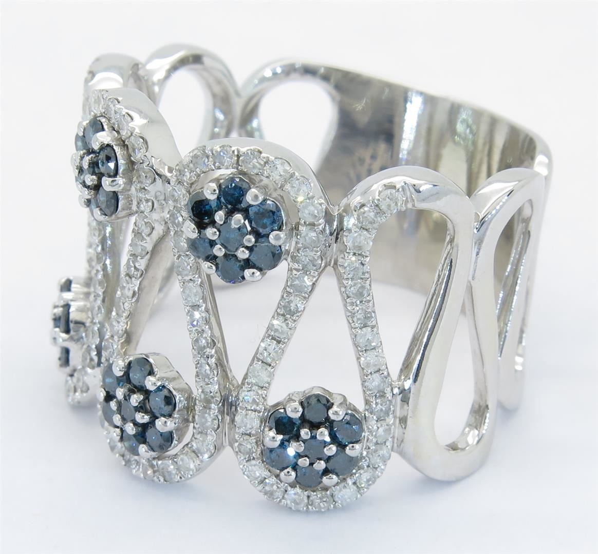 One tested 14K white gold diamond ring. Containing: 97 Round Single Cut Diamonds with H-J color and I-SI clarity. 36 Blue Round Brilliant Cut Diamonds with I-SI clarity. Approximate total diamond weight: 1.39CTW. Diamonds are graded in the mounting, unless otherwise stated. Weight of ring: 8.8 grams. Size: 10.0.