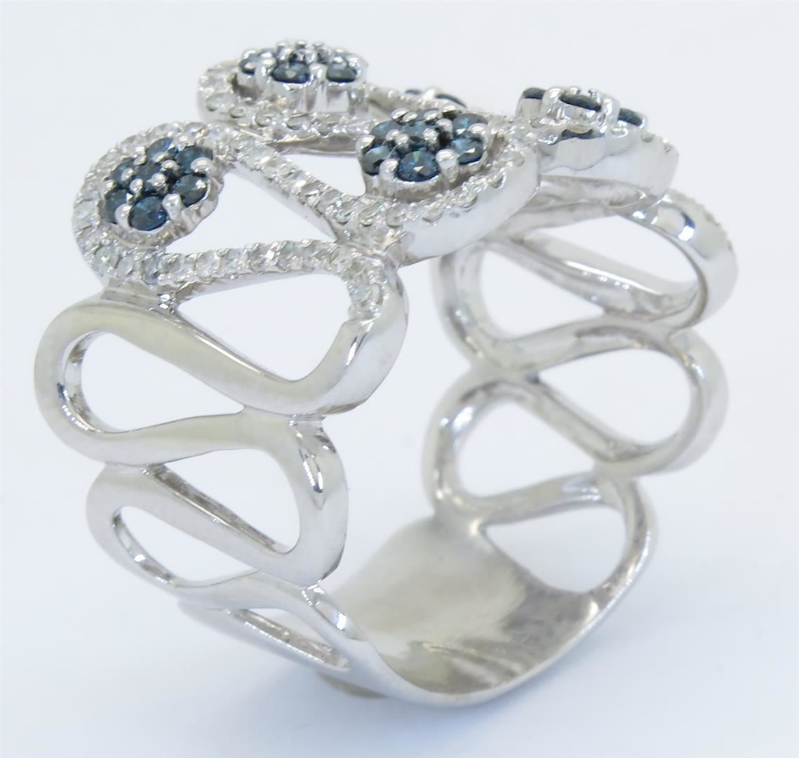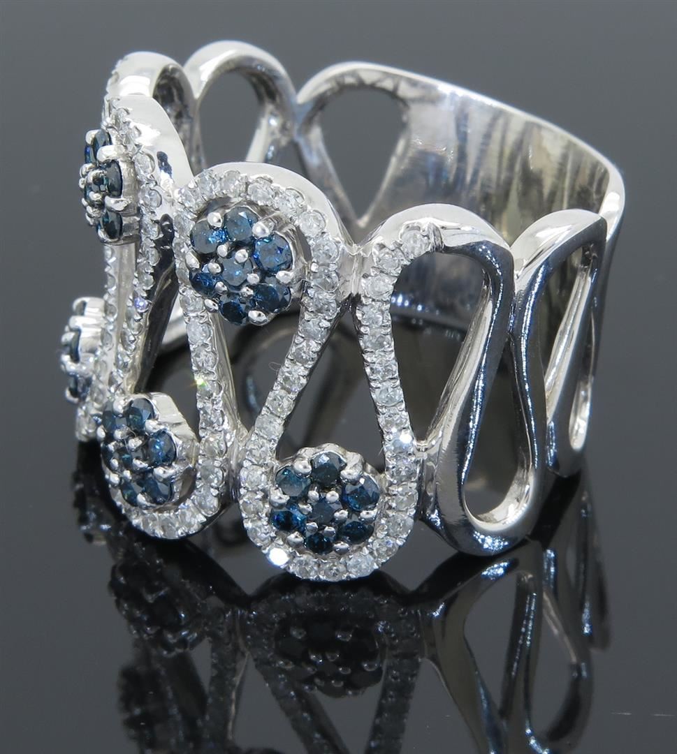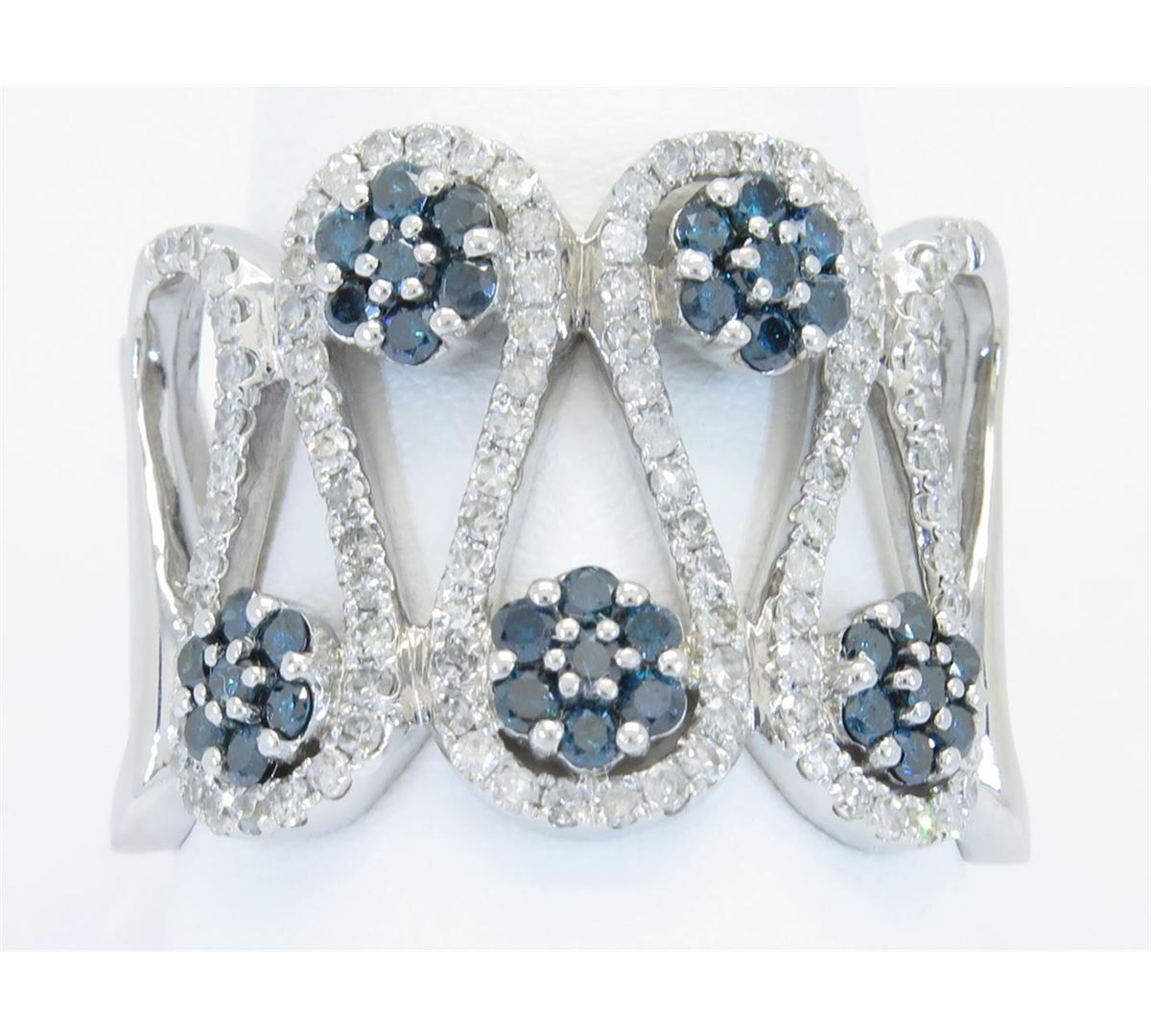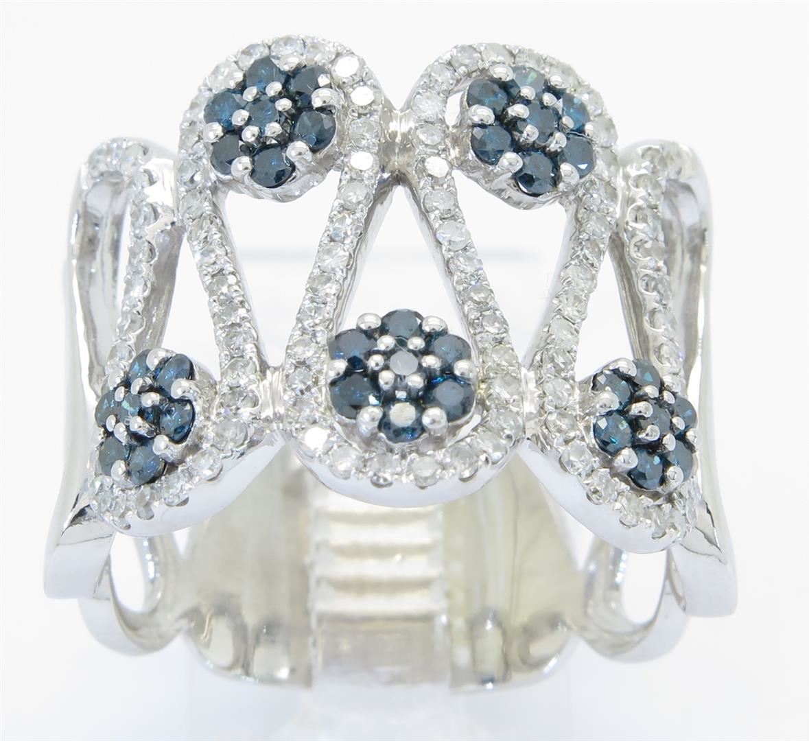 One tested 14K white gold diamond ring. Containing: 97 Round Single Cut Diamonds with H-J color and I-SI clarity. 36 Blue Round Brilliant Cut Diamonds with I-SI clarity. Approximate total diamond weight: 1.39CTW. Diamonds are graded in the mounting, unless otherwise stated. Weight of ring: 8.8 grams. Size: 10.0.