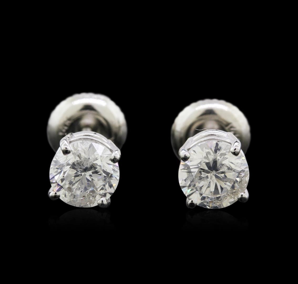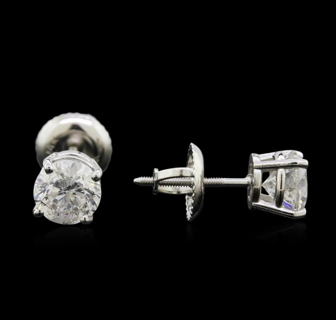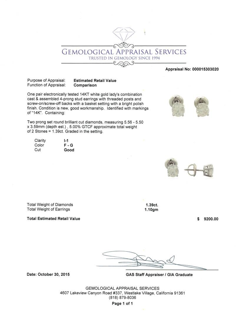 One pair electronically tested 14KT white gold lady's combination cast & assembled 4-prong stud earrings with threaded posts and screw-on/screw-off backs with a basket setting with a bright polish finish. Identified with markings of "14K". Condition is new, good workmanship. Containing: Two prong set round brilliant cut diamonds, measuring 5.56 - 5.50 x 3.59mm (depth est.) , 5.00% GTCF approximate total weight of 2 Stones = 1.39ct. Graded in the setting. Clarity: I-1. Color: F - Good. Total Weight of Diamonds 1.39ct. Total Weight of Earrings 1.10gm. GAS Appraised.