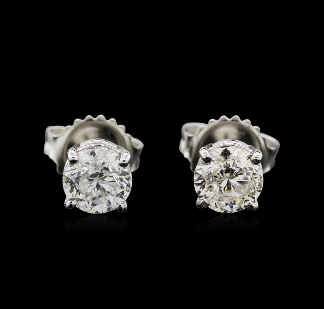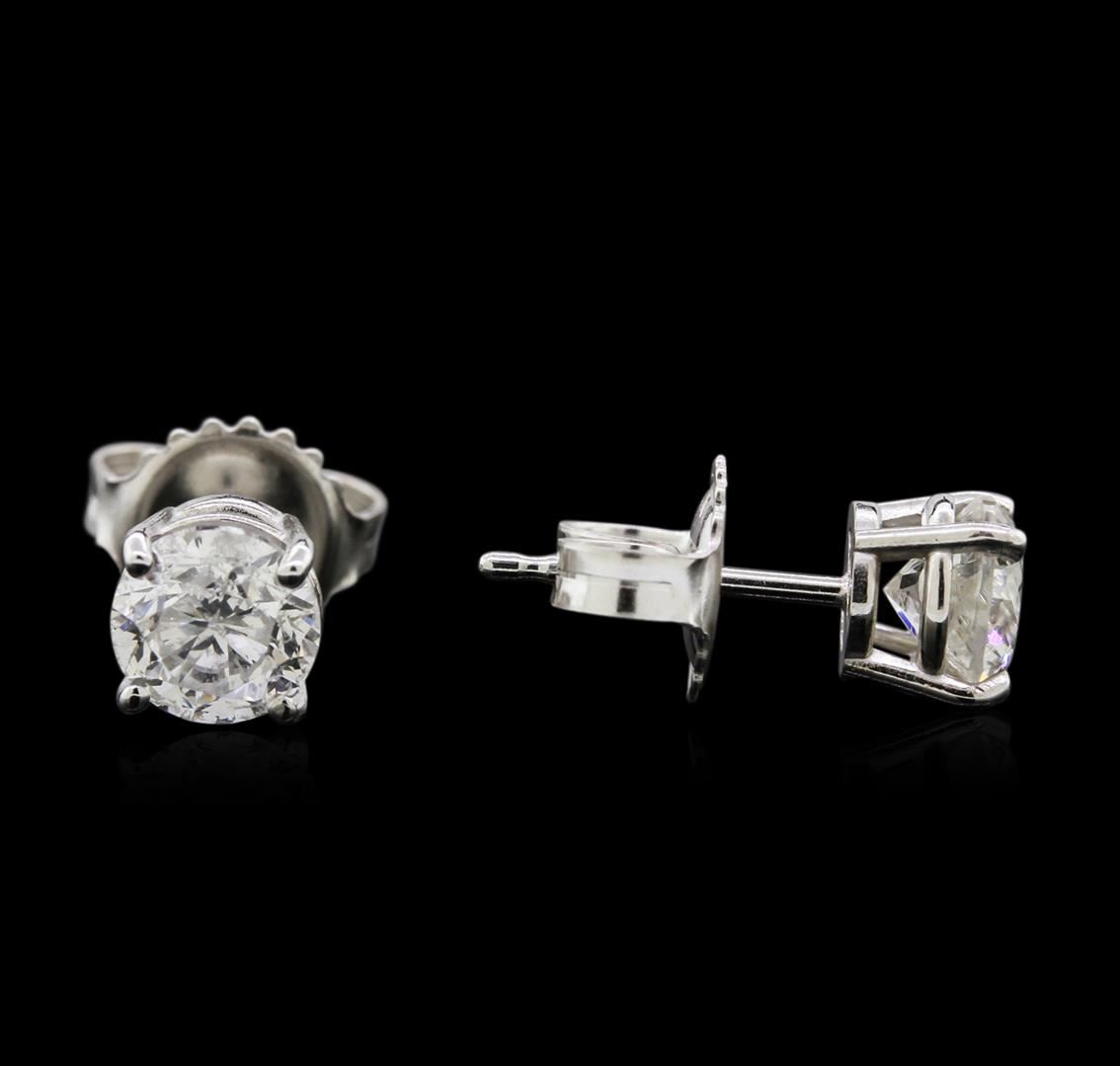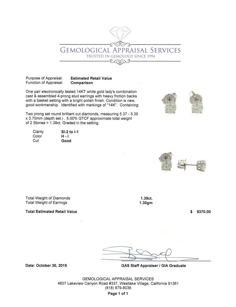 One pair electronically tested 14KT white gold lady's combination cast & assembled 4-prong stud earrings with heavy friction backs with a basket setting with a bright polish finish. Identified with markings of "14K". Condition is new, good workmanship. Containing: Two prong set round brilliant cut diamonds, measuring 5.37 - 5.35 x 3.70mm (depth est.) , 5.00% GTCF approximate total weight of 2 Stones = 1.39ct. Graded in the setting. Clarity: SI-2 to I-1. Color: H - I. Cut Good. Total Weight of Diamonds 1.39ct. Total Weight of Earrings 1.30gm. GAS Appraised.
