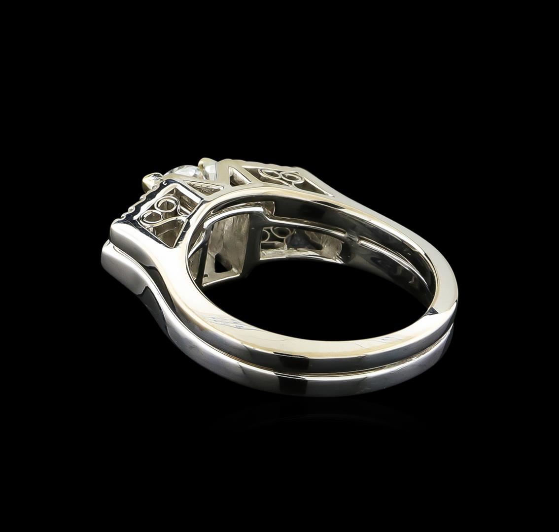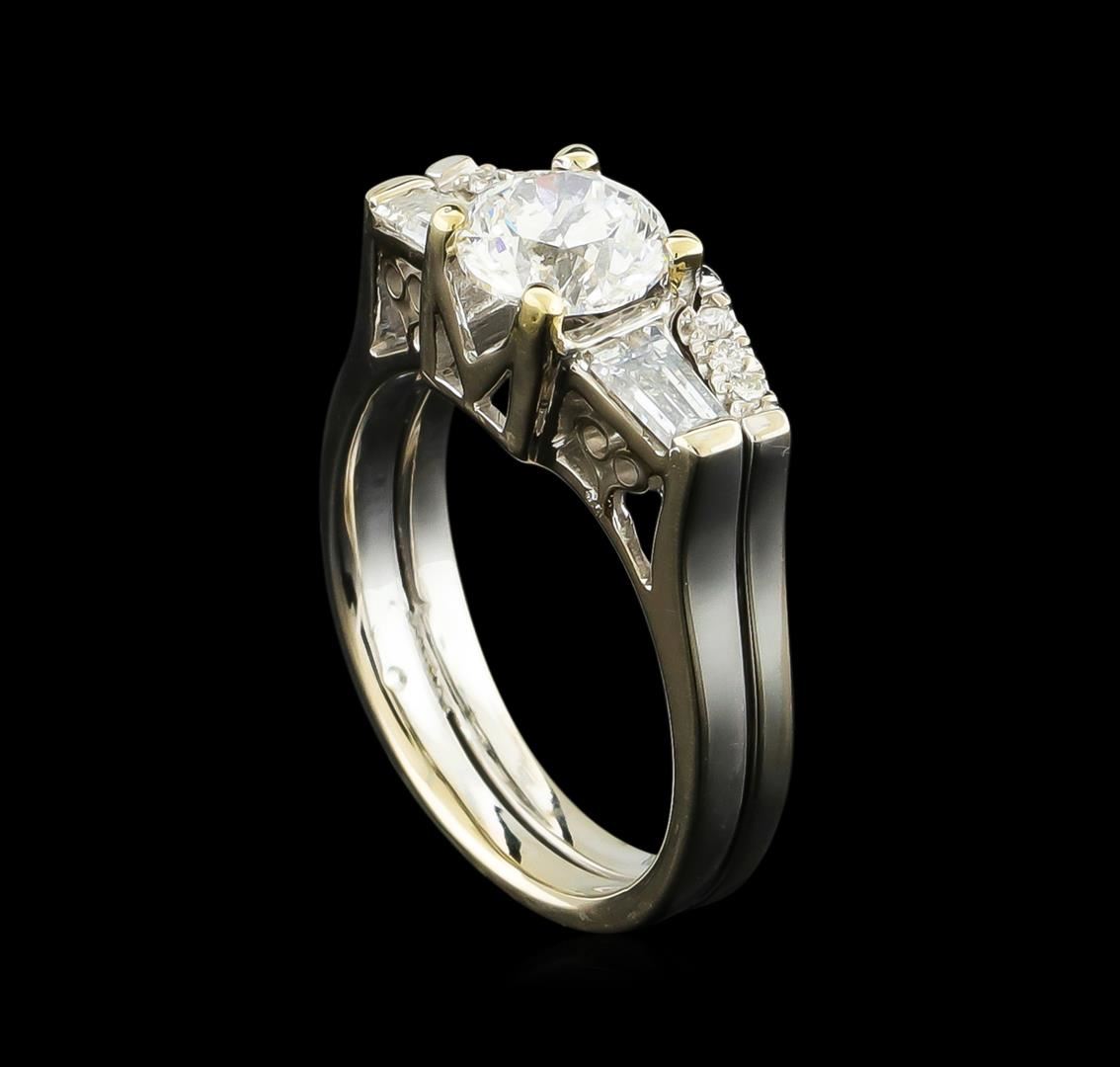 One electronically tested 14KT white gold ladies cast & assembled diamond wedding set. Condition is good. The wedding set includes a diamond engagement ring and a diamond wedding band. The engagement ring features a diamond accented by a single baguette on either side. The set is completed by a combined three and one-half millimeter wide bands. Bright polish finish. Ring size is 5.25. Containing: One prong set round brilliant cut diamond, measuring 6.10 - 6.00 x 3.90mm (depth est.) approximate weight of 0.96ct. Graded in the setting. Clarity: I-1. Color: I. Depth: 64.5%. Table: 57.9%. Two channel set baguette cut (tapered) diamonds, measuring from 4.10 x 2.50 x 1.75mm (depth est.) to 4.20 x 2.50 x 1.75mm (depth est.) approximate total weight of 2 Stones = 0.33ct. Graded in the setting. Clarity: SI-2 to I-1. Color: G - H. Six prong set round brilliant cut diamonds, measuring 1.40 - 1.30 x 0.81mm (depth est.) approximate total weight of 6 Stones = 0.10ct. Graded in the setting. Clarity: VS-2 to SI-1. Color: G - H. Total Weight of Diamonds 1.39ct. Total Weight of Wedding Set 5.29gm. AIG Appraised at $13,810.00.